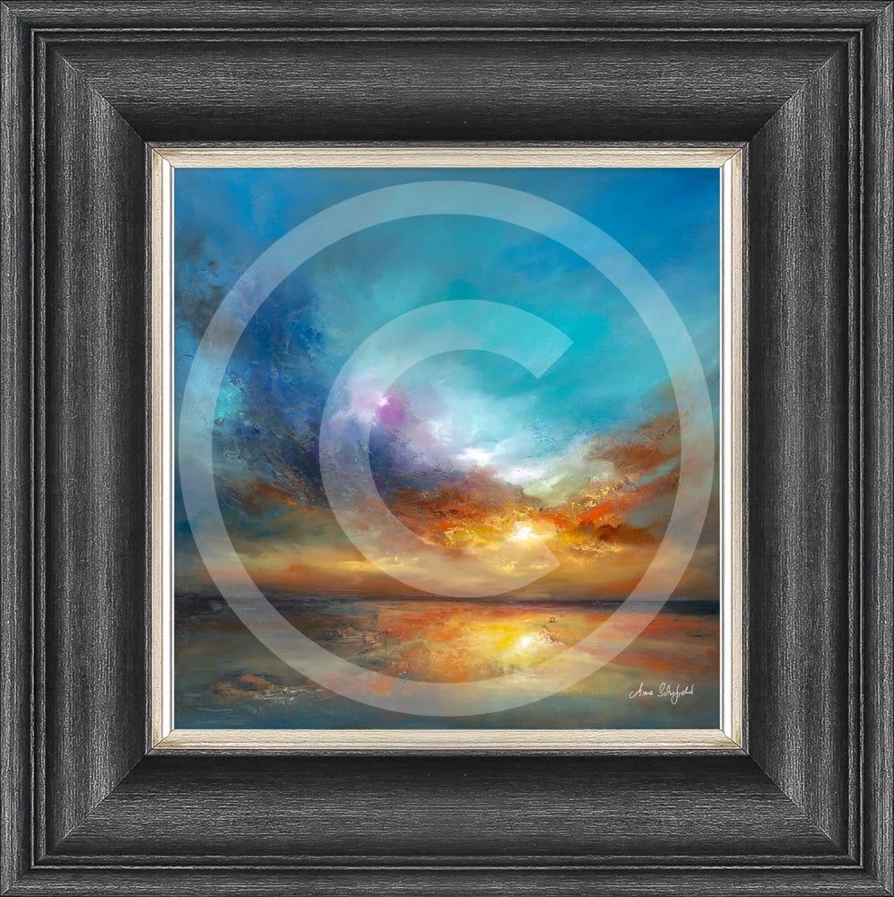 A framed unglazed print of a dramatic and vibrant sunset disappearing over the sea by artist Anna Schofield. Made in the UK, it's finished with a hand-applied artist's texture gel and presented in a deep scoop gunmetal coloured frame, ready to hang on your wall.