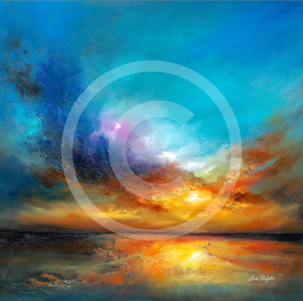 Amazing Sunset by Anna Schofield: A dramatic and vibrant sunset disappearing over the sea by artist Anna Schofield. Made in the UK, the image is printed on canvas, bonded onto rigid board and presented on a stretcher frame, ready to hang on your wall.
