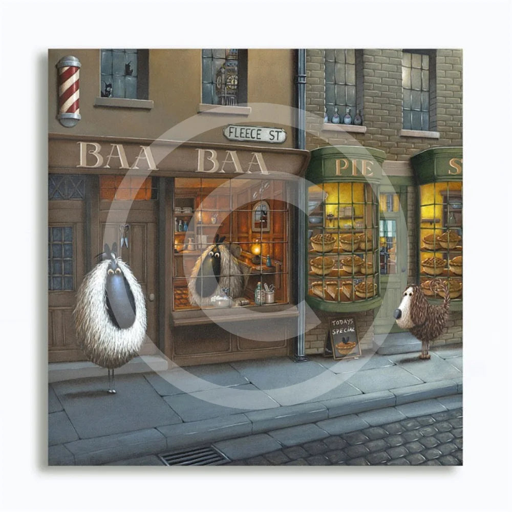 Baa Baa of Fleece Street has an image size of 55x55cm framed, and external frame size of 67x67cm, and 25x25cm (mini) or 50x50cm on canvas. All sizes are approximate.