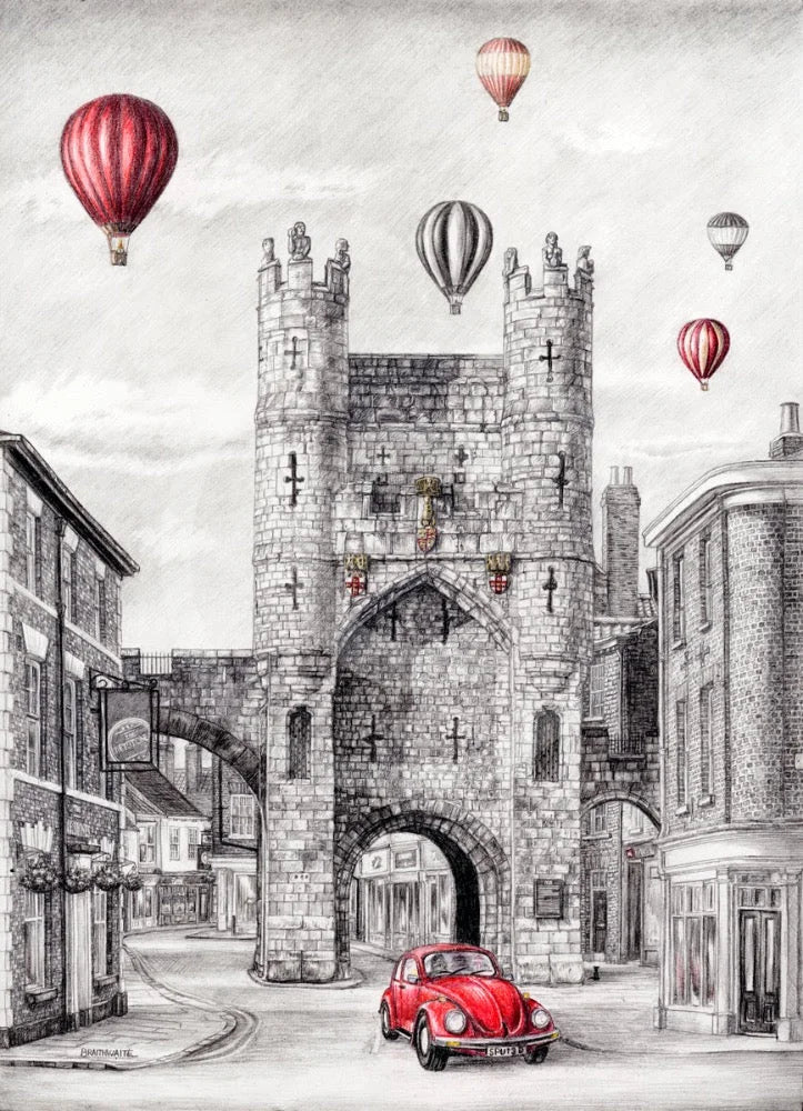 The view is of Monk Bar is York's city walls, with hot air balloons overhead. Can you spot Mark's little black cat, Lucy, who is included in all of his York artwork?