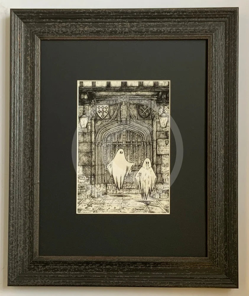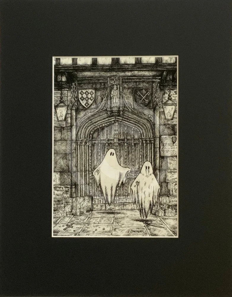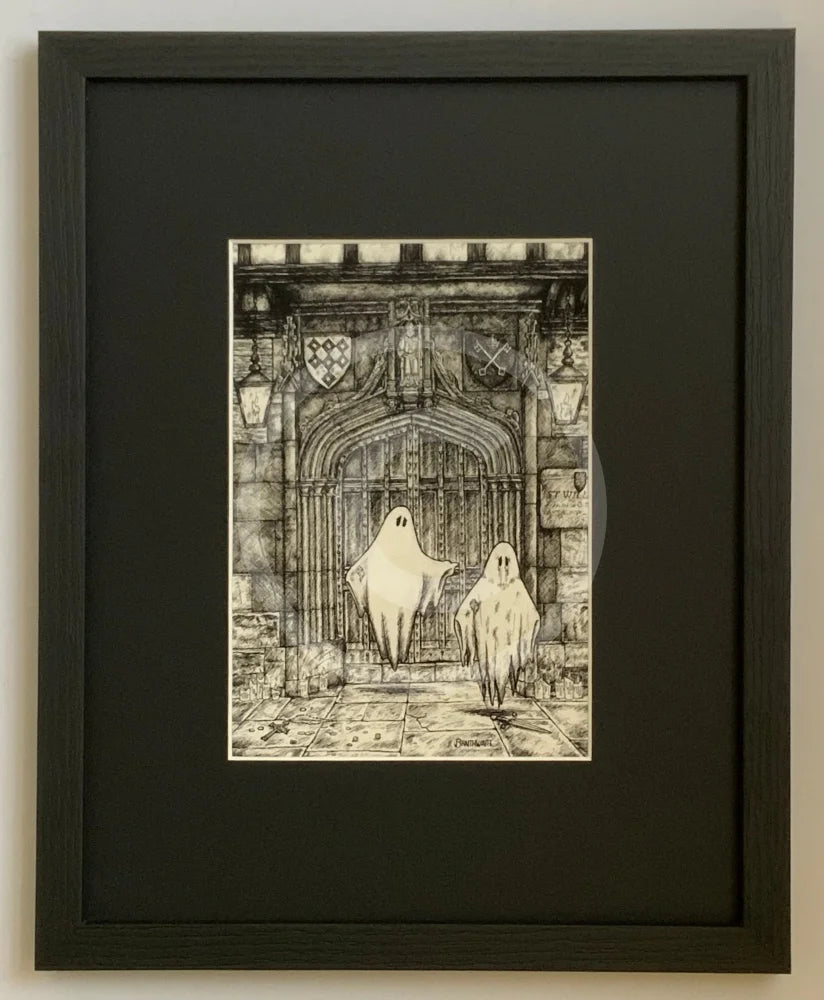 A Brother Betrayed. This black and white ghost art print features two spirits floating outside the Gothic door of St William’s College, in the haunted City of York. This ghostly image is part of the Beneath the Sheets series created by resident artist M.J. Braithwaite. Great gift idea for fans of the paranormal or to include in your Halloween home decor.