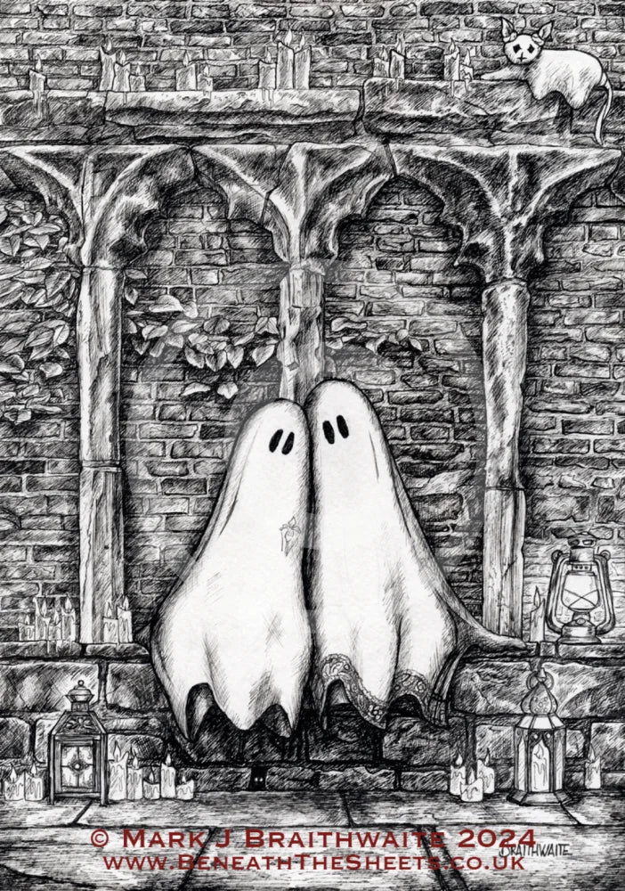 It was not, however, the lovers that piqued my interest, but something rather more fascinating that sparked my scientific curiosity. Above this romantic scene I glimpsed the slightest of movements atop the arches which appeared to be a ghostly cat clinging to the archways like lichen. This animal was curiously different to any of my other ghostly encounters as it looked directly at me, following my every move. I tore a sheet of paper from my journal, screwed it into a ball and then threw it to my side. The cat jerked its head in the direction of the paper ball but remained exactly where it was, continuing to stare at me for some time, seemingly waiting for me to provide it with further entertainment. I found this to be a most interesting encounter, albeit only with an animal, as it was my first real contact with the afterlife. This feline I shall call Moss on account of the way it clung to the archway. I intend to pay it another visit in the coming days and bring with me other items of potential interest to it that might allow me to investigate our interactions further.”