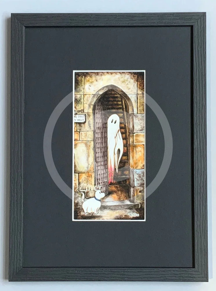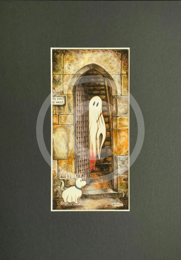 A Rebellious Spirit. This ghost art print in colour features a spirit with an arrow in his chest, wearing a touch of red tartan. A nod to his Scottish heritage no doubt. This rebellious ghost encourages his canine friend to enter the old door way of the historic Monk Bar in the City of York, ignoring the ‘No Dogs on the City Walls’ sign. This ghostly image is part of the Beneath the Sheets series created by resident artist M.J. Braithwaite. Great ghost gift idea for fans of the paranormal or for your Halloween home decor.