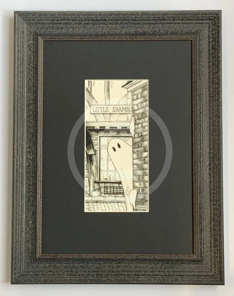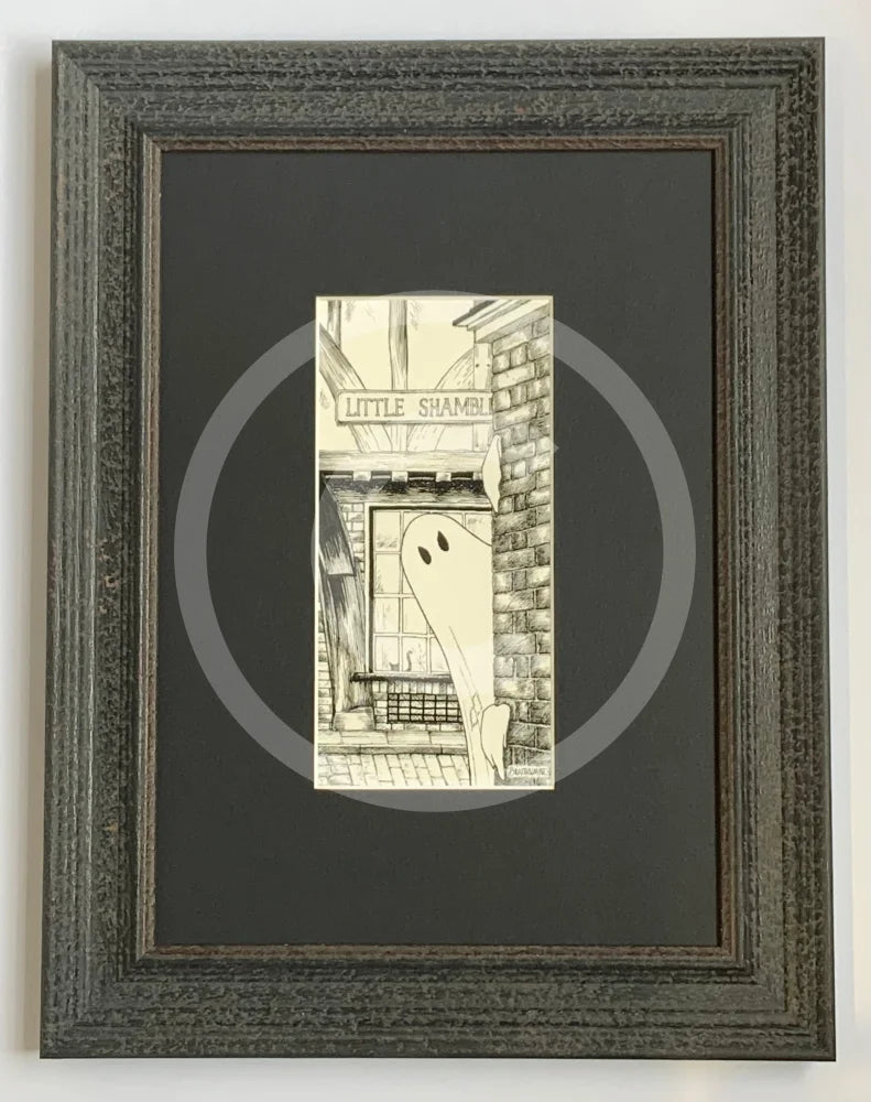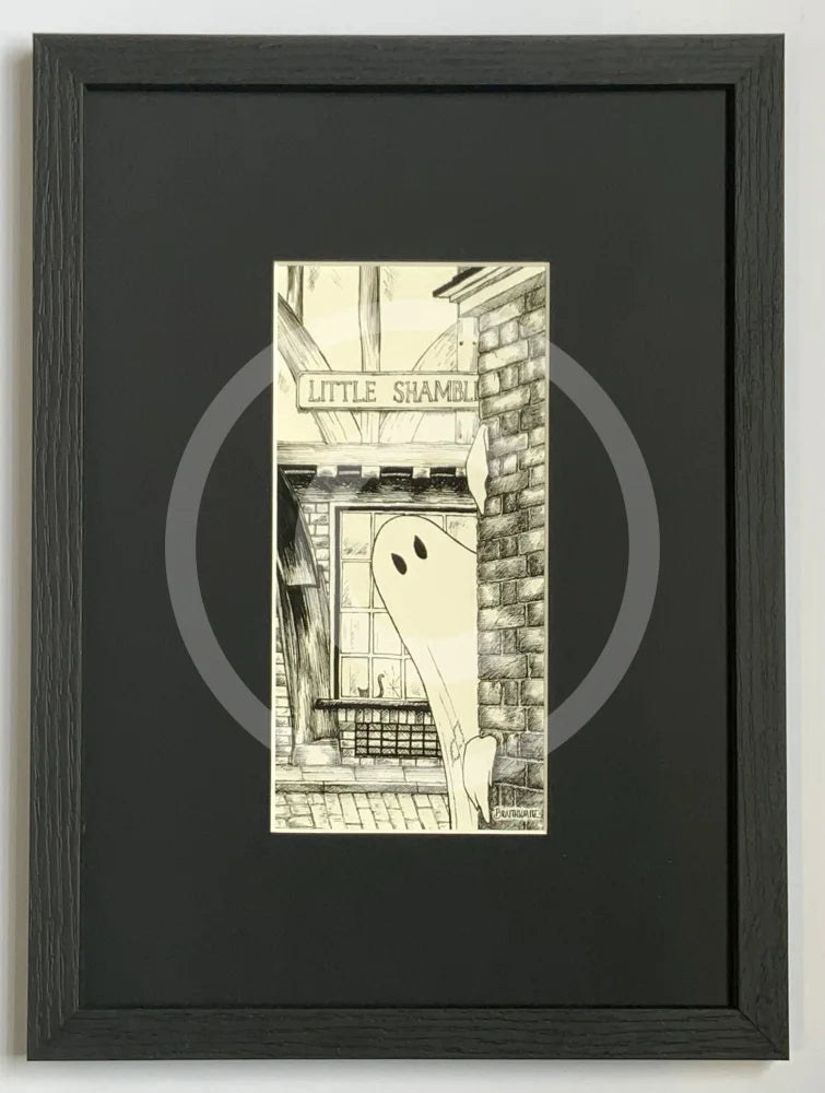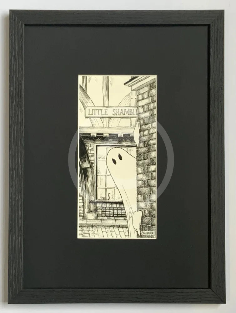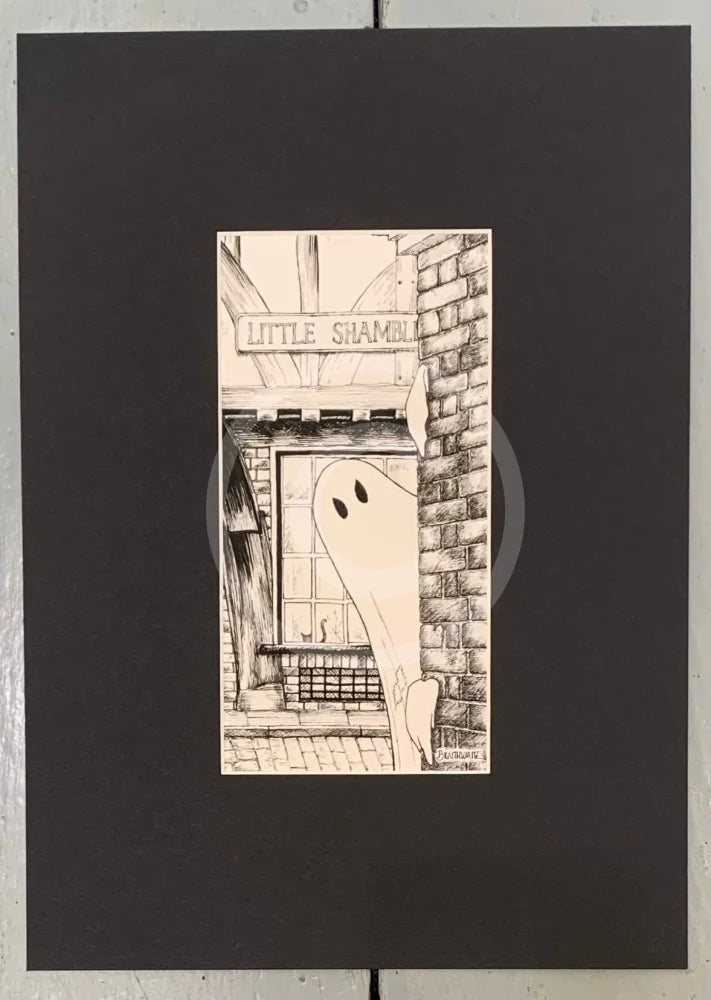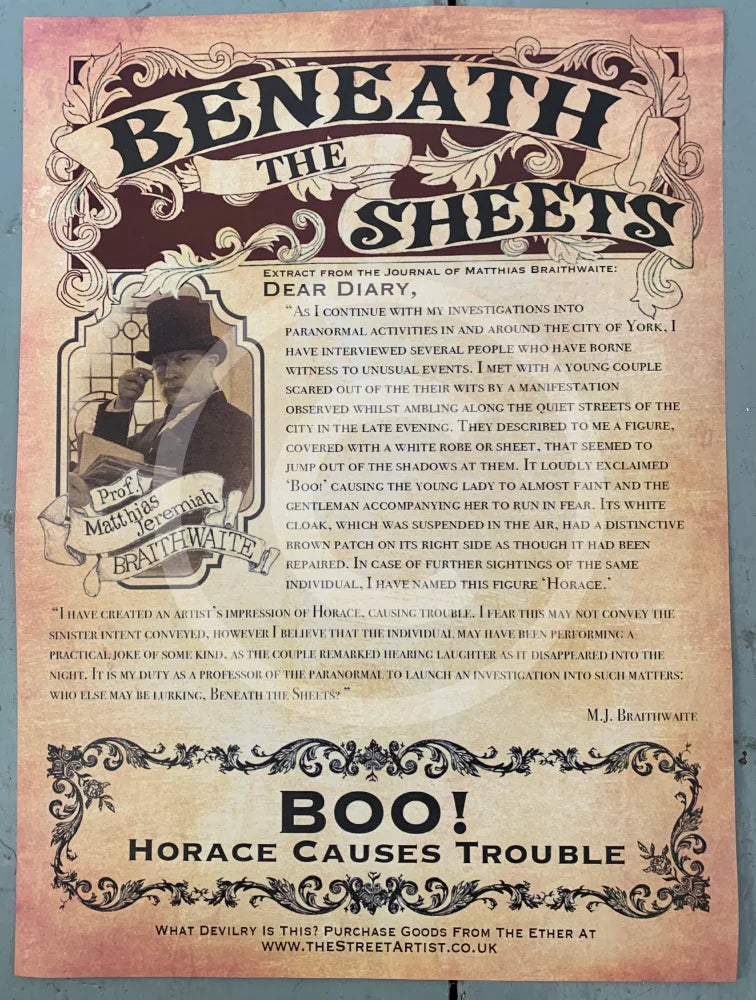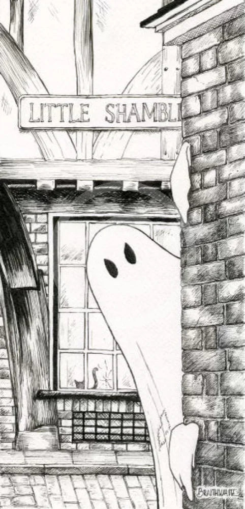 Boo! Horace Causes Trouble. This black and white York ghost art print features a cheeky spirit hiding around the corner of the famous medieval street of The Shambles in the historic haunted City of York. This ghostly image is part of the Beneath the Sheets series created by resident artist M.J. Braithwaite. Great ghost gift idea for fans of the paranormal or for your Halloween home decor.