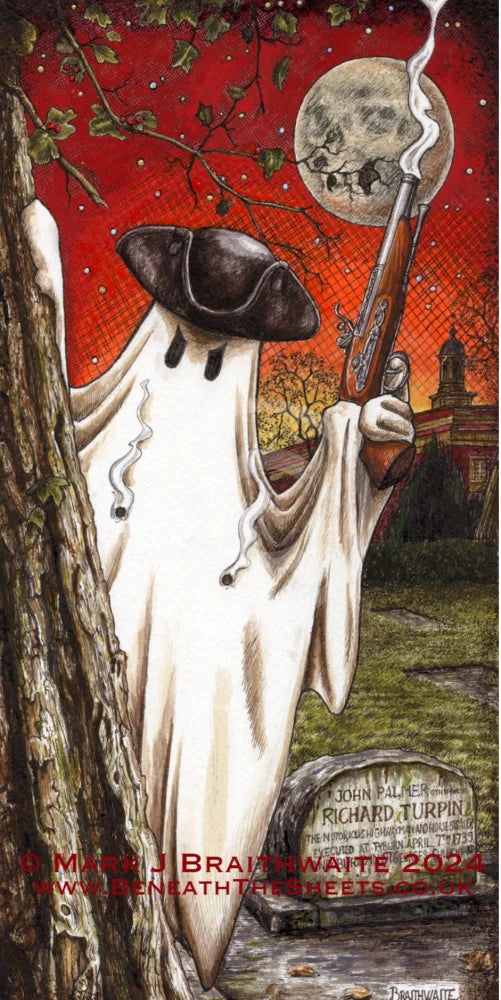 By the blood red light of sunset, in a hushed graveyard, I encounter a dastardly fellow - none other than the notorious highwayman Richard Turpin. He stands before me, musket in hand, all threat and menace, blackened eyes full of malice. A tricorn hat perches atop his shrouded head and the garment bears two smoking holes where his enemy had fired upon him.