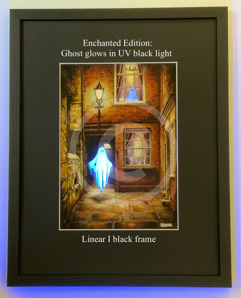 The enchanted edition of the print is larger than other formats - presented in a black mount with outer dimensions 18x14." When viewed under black light, the ghostly image glows. This special effect has been hand painted and signed by the artist.