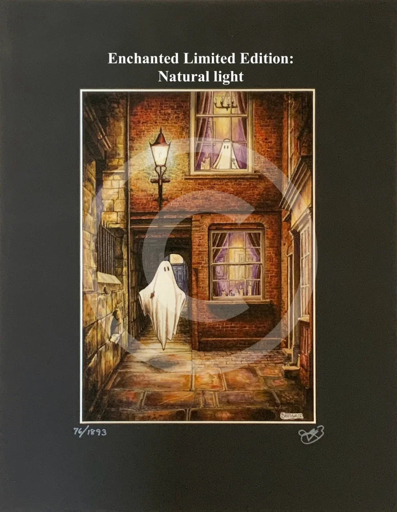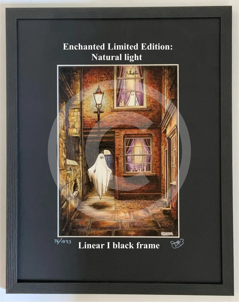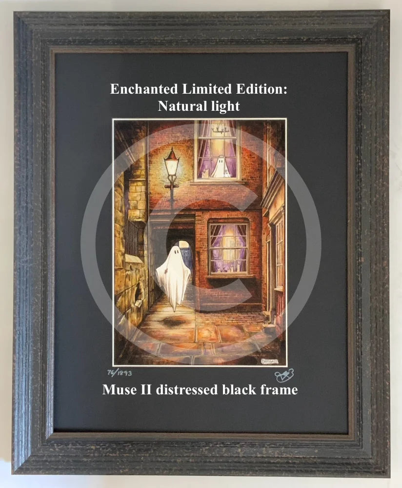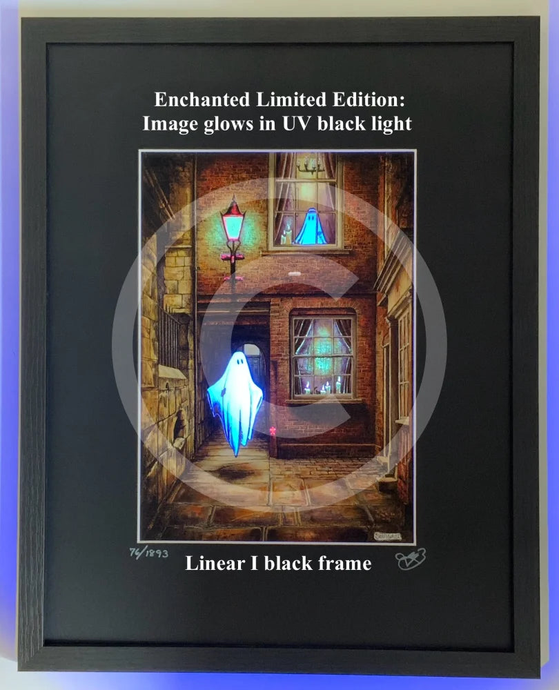 The enchanted edition of the print is larger than other formats - presented in a black mount with outer dimensions 18x14." When viewed under black light, the ghostly image glows. This special effect has been hand painted and signed by the artist.