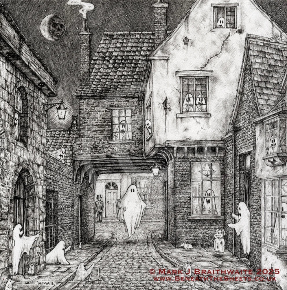 Upon entering Bedern I feel most uneasy as many scoundrels and ladies of ill-virtue still walk the cobbled streets. I am reluctant to take out my bejewelled clockwork lantern in such a squalid place and have brought my sword, concealed within a walking stick, in the hope that it will deter any who may try their luck with me. As the purple glow fills the street I spot upon a rooftop the local legend, “White Paws” the ratter. He is not in ghostly form, but below in the street the beam picks out small scurrying ghostly forms of what looks like several of his victims. It is then that I spy, framed in the covered passage that leads to the back streets, a large shrouded figure clutching in his hand a bottle of cheap liquor. He looks nervous and I can see that from every window and doorway small spirits seem to reach forward towards him. Fourteen poor souls - the same number of bodies found within the workhouse - their angry faces pointing in the direction of the rotund figure and their little shrouds torn just below the eye holes to form a grimace or twisted scream. Far removed from the accounts I have been told of playing children, I have perhaps witnessed the deserved hell in which the soul of the despicable Pimm resides. Beyond the covered passageway at the far side of the street I spy the familiar top-hatted man with the bandaged face. His appearance at yet another site of ghostly activity troubles me deeply and my curiosity is pricked by what his involvement may be, my unease growing with each encounter.