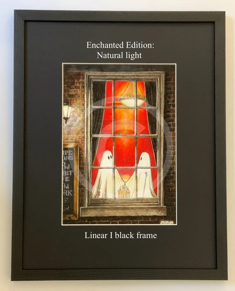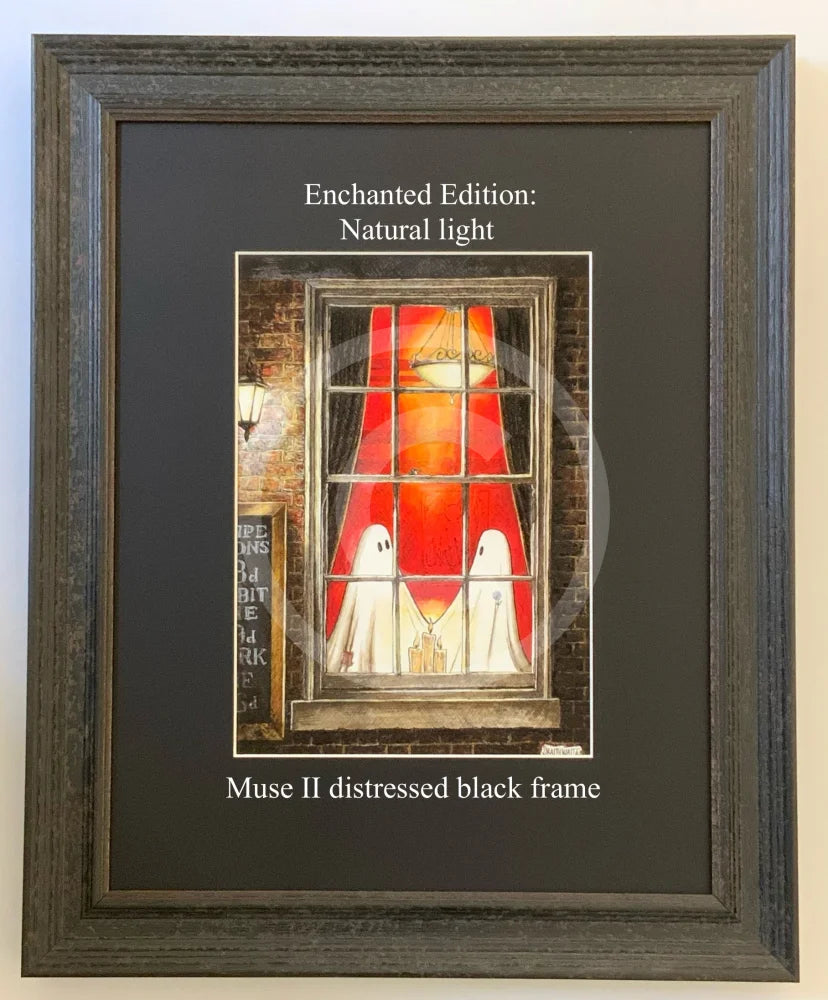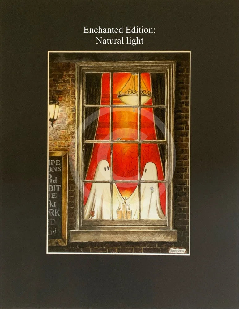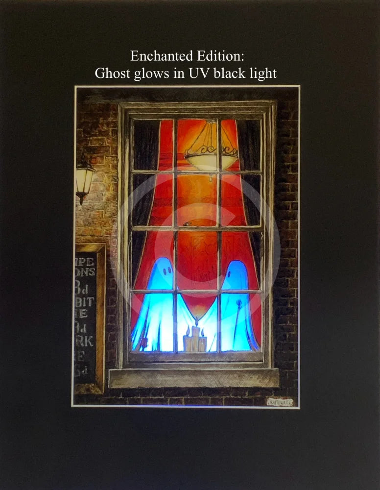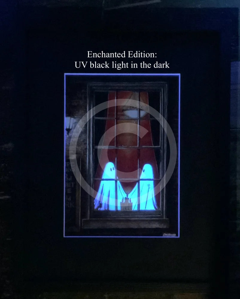 The enchanted edition of the print is larger than other formats - presented in a black mount with outer dimensions 18x14." When viewed under black light, the ghostly image glows. This special effect has been hand painted and signed by the artist.