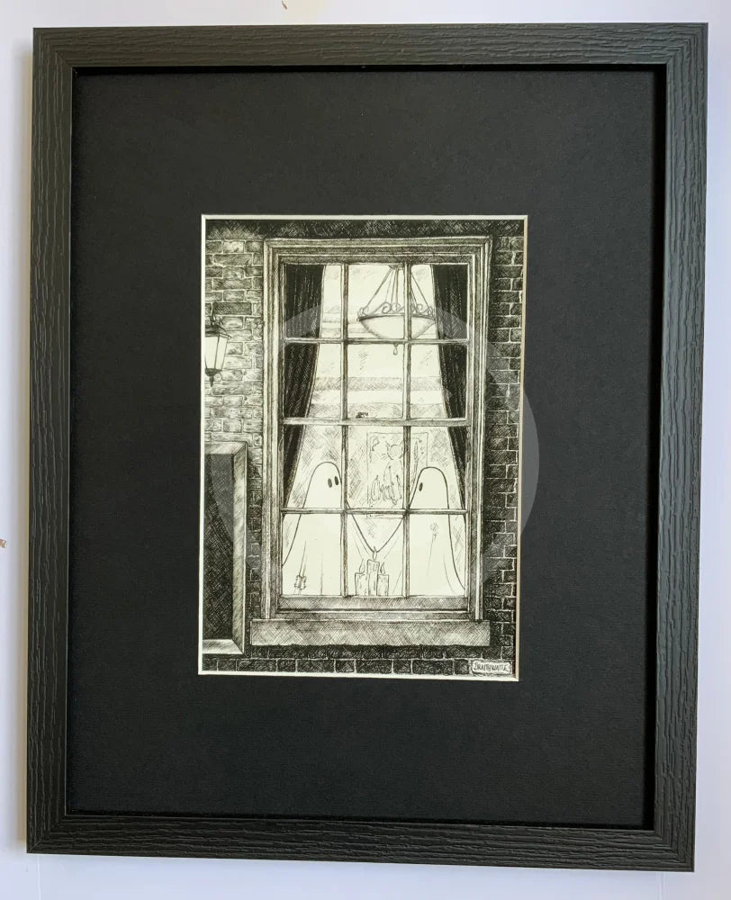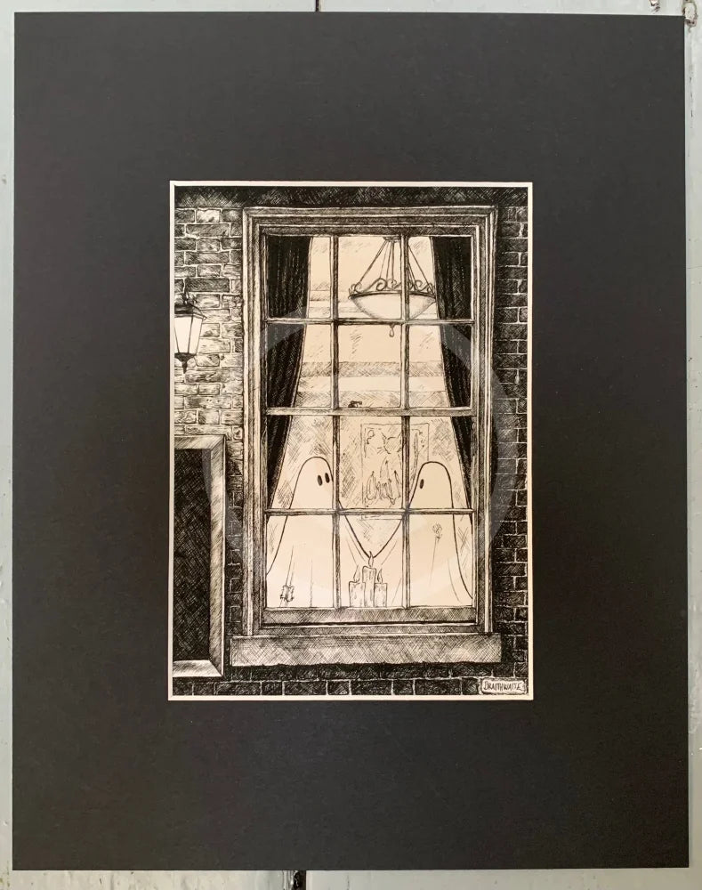 "He and his friends had been discussing sporting events in the street outside Young’s Hotel, when out of the corner of his eye he spied a strange glow coming from the window. In the window behind a brace of candles sat two shrouded figures, their eyes as black as coals, their shrouds aglow. He described the glow as a white fire brighter than the candles on the sill. The figures were almost identical except the figure to the left had a torn, patched shroud and that the right had delicate embroidery of a blue flower, similar to a daisy. They appeared to be looking into each other’s jet black eyes as lovers would.