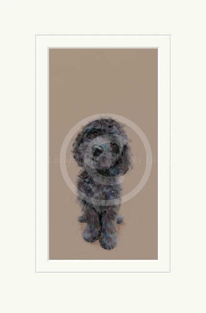 A gorgeous print of a young black puppy on a striking taupe coloured background. Does your doggy look at you just like that? Awww... How cute.