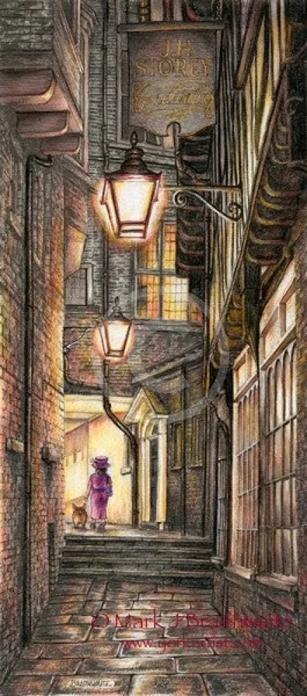 Here, Betty and Toffee the corgi are taking an evening stroll around the snickleways of York; historic Lady Peckett's Yard looks rather fine by lamplight.