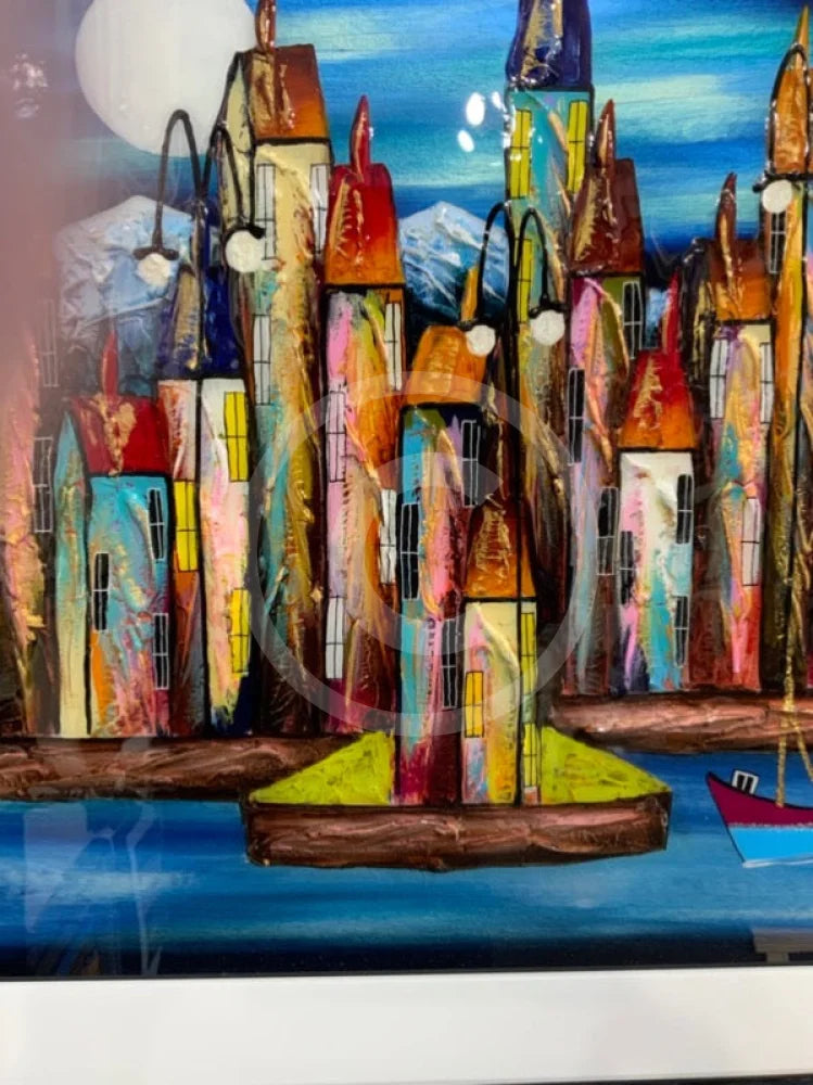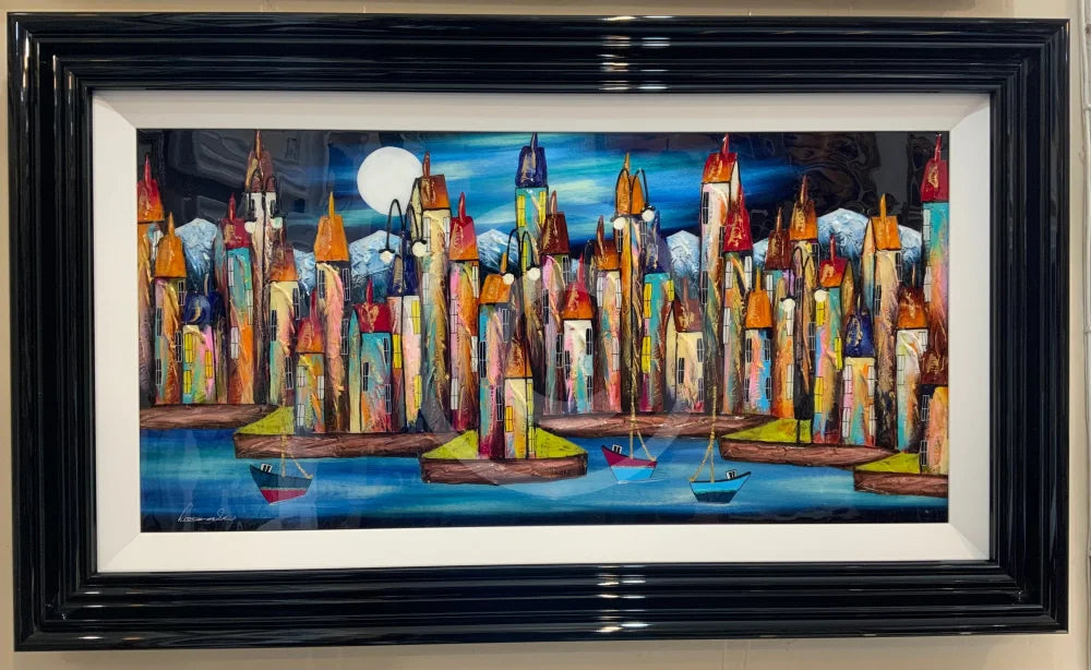 A stunning painting in mixed media by best selling artist Rozanne Bell. Roz paints in textured acrylic on board with multiple layers of resin. The colours are rich and vibrant in this striking harbour coastal scene. The painting is presented in a wide high gloss black wood frame with inner white slip as shown.