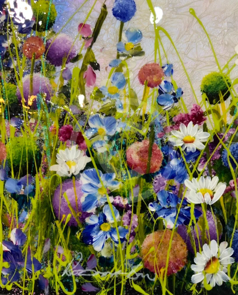 A stunning original floral meadow painting in mixed media by best selling artist Rozanne Bell. Roz paints in textured acrylic on board with multiple layers of resin. The colours are rich and vibrant in this summer meadow, filled with wild flowers and bees. This original art work is presented in a wide matt white wood frame with a white inner slip as shown.