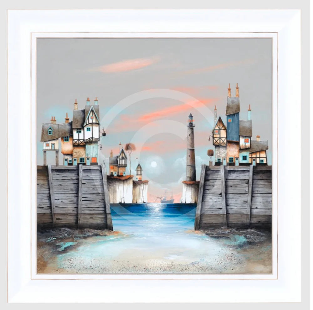 A quirky original acrylic painting by one of our most popular artists, Gary Walton. Gary’s distinctive quirky style shines through with this original coastal seascape. This original painting is signed by the artist and is presented in a wide white frame.