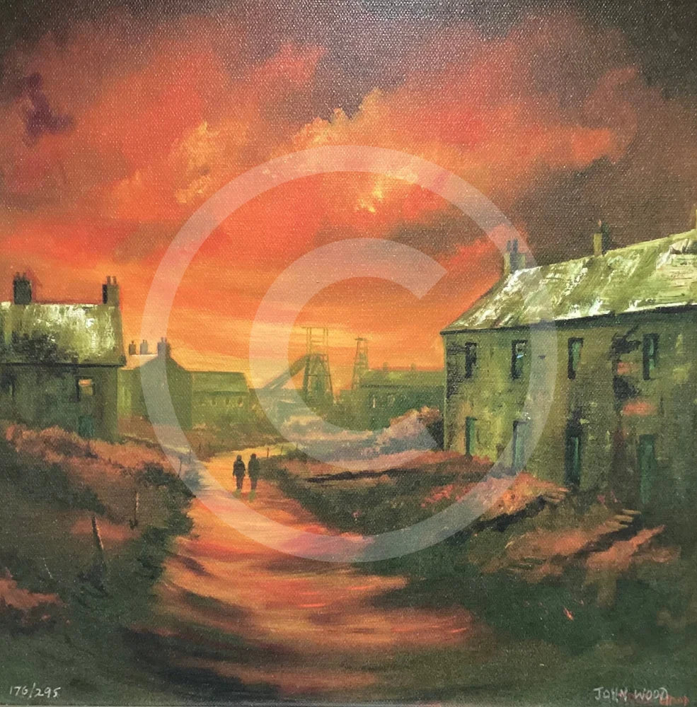 A nostalgic and atmospheric depiction of everyday life in the towns of Northern England — dark industrial streets illuminated by a vivid, burning orange sky. This is John Wood at his most evocative: gritty, warm, and deeply rooted in the Northern experience.
