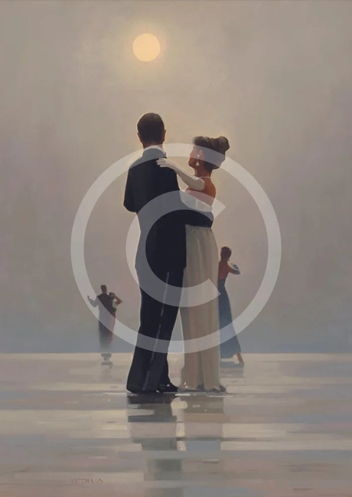 On a misty beach a couple are dancing - he in tuxedo and she in a beautiful, white, floor length gown. The colours in this print are all muted shades of blue and grey creating a quietly romantic scene.