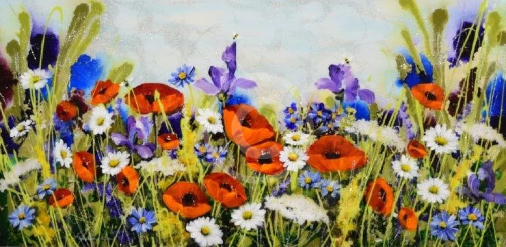 Rozanne Bell's summertime field of dreams invites you into a vibrant meadow alive with red, blue, and purple blooms.