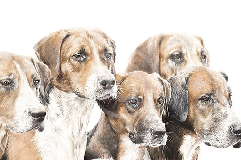 A foxhound group portrait from canine artist Nicola Gillyon.