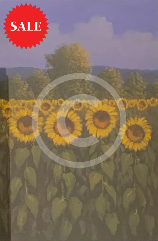 An original painting by David Short featuring a field of yellow sunflowers, heads blowing in a gentle Summer breeze.
