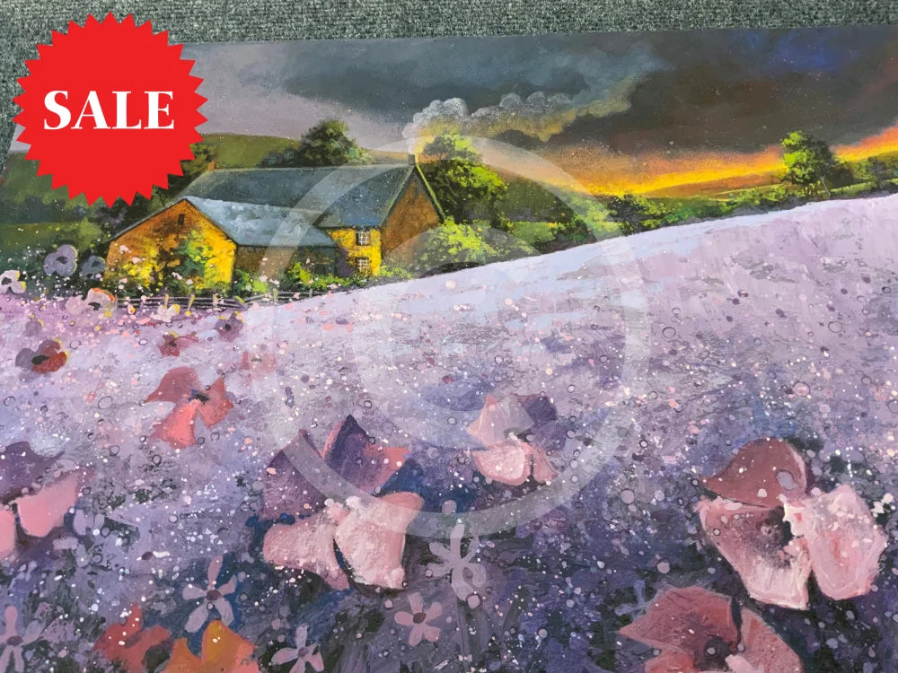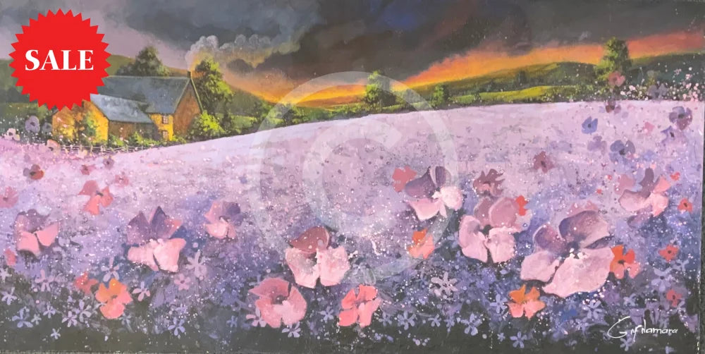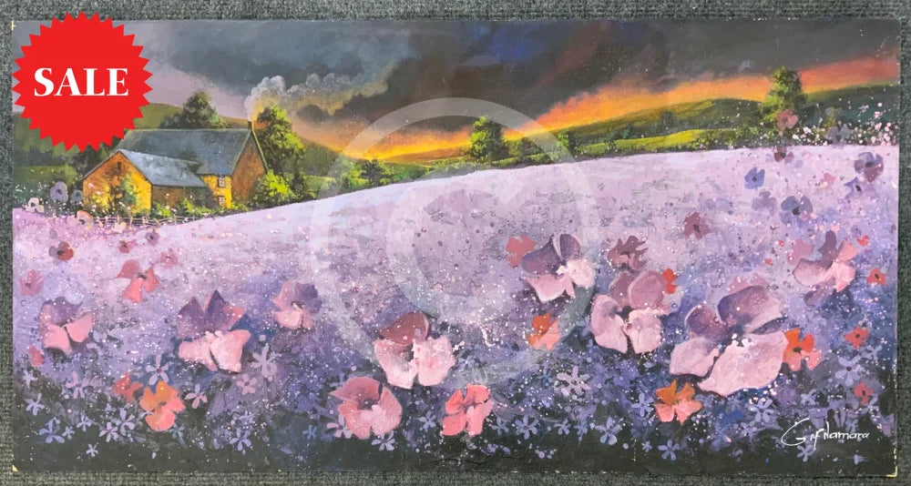 An original landscape oil painting by Gary McNamara featuring a field of purple flowers. A cosy countryside cottage sits above the purple haze with a colourful sunset setting over the green hills.