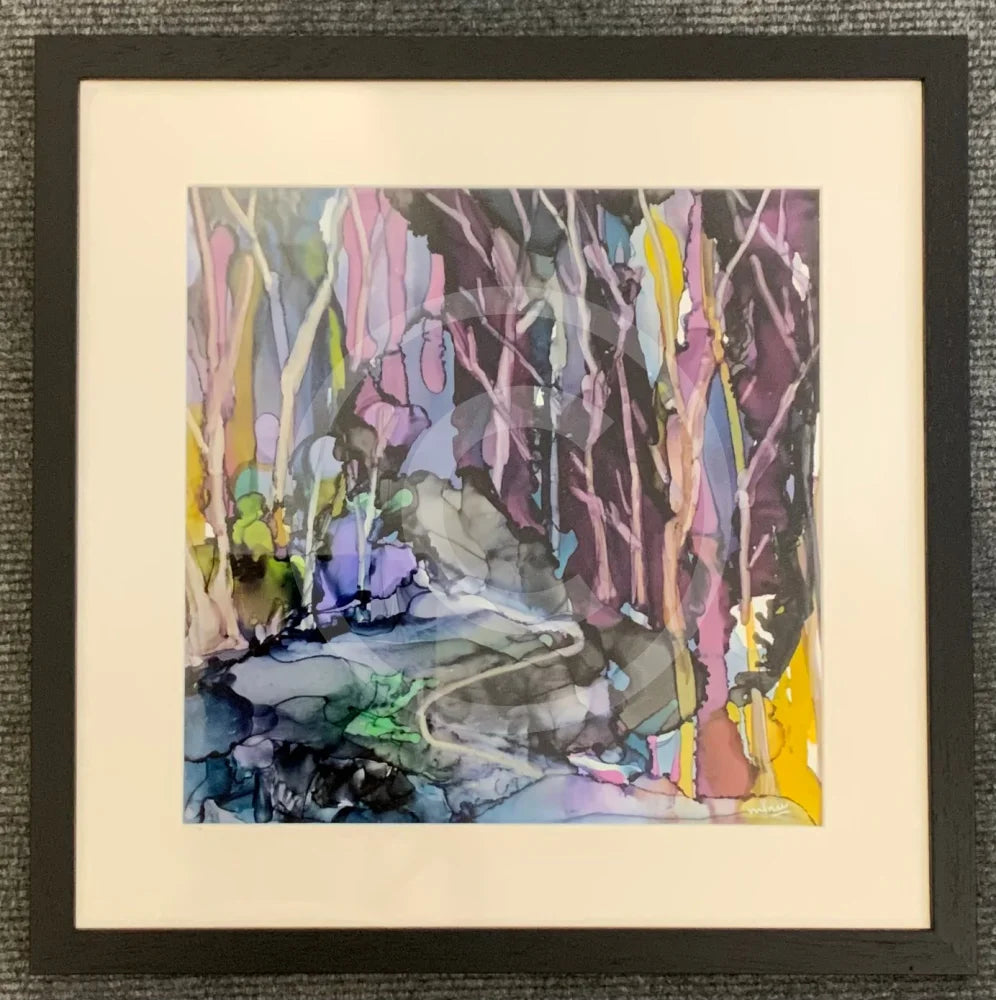 Finding my the Path through the Woods, an original artwork in alcohol based inks, mounted in white and presented in a black grain wooden frame.