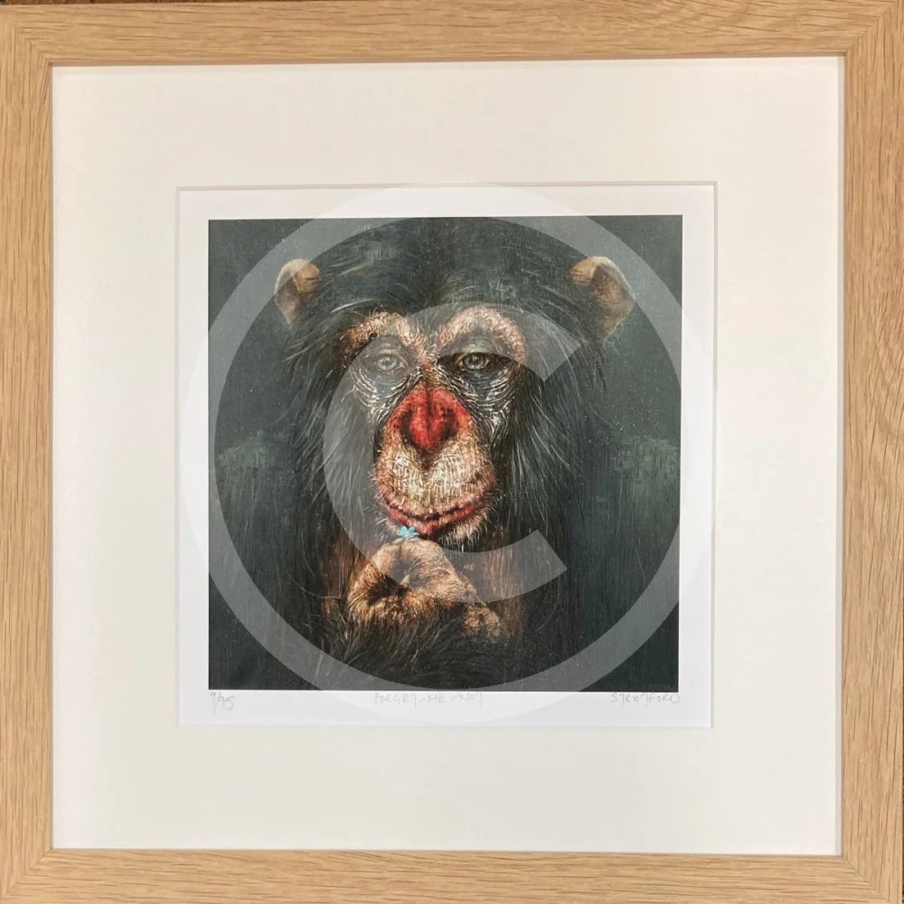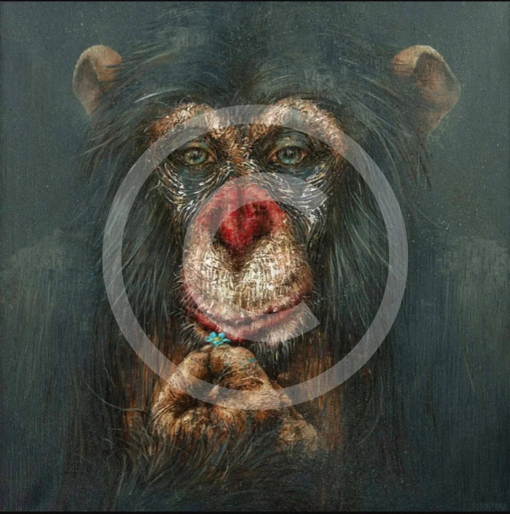 A limited edition giclée print of a chimp/monkey poised in thought holding a single forget-me-not blue flower in his hand.