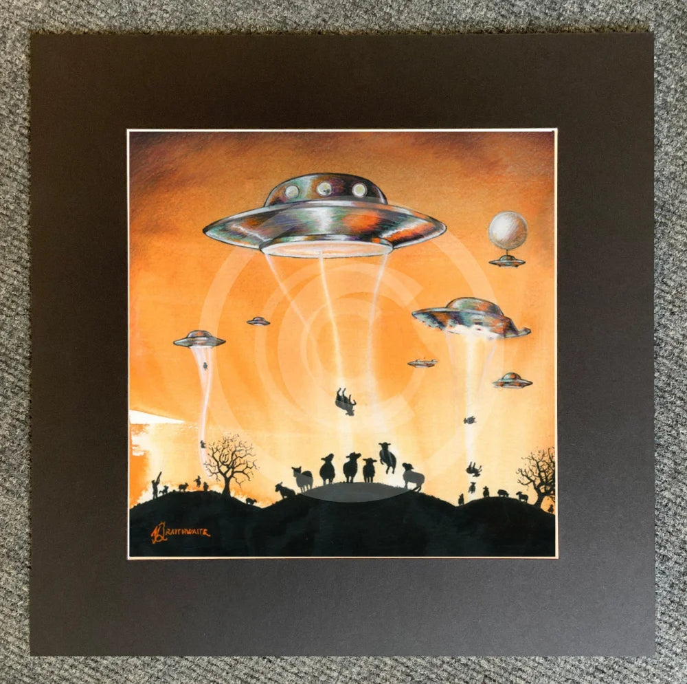 Inspired by 1950s sci-fi, Mark has painted an invasion of spaceships, arriving over the hills, beneath a stunning orange sky. The little green men are beaming up a flock of sheep. Whatever for?! The farmer and his dog are trying to scare off the Martian invaders - it doest look like they're having much success!