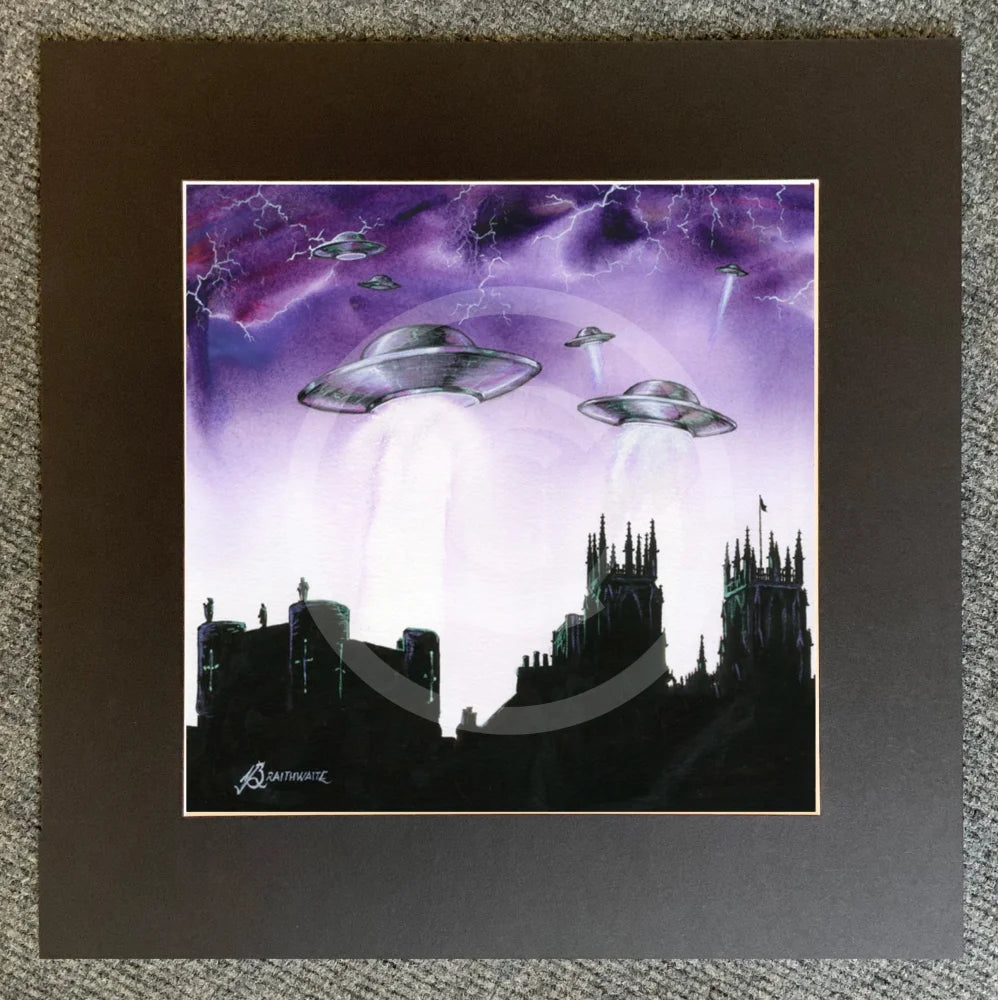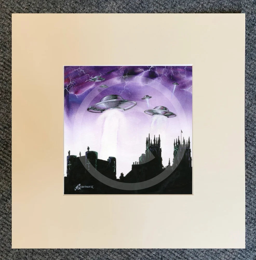 Inspired by 1950s sci-fi, Mark has painted an invasion of spaceships, arriving over York Minster and city walls, under a stunning purple sky. Who will the little green Martians beam up?