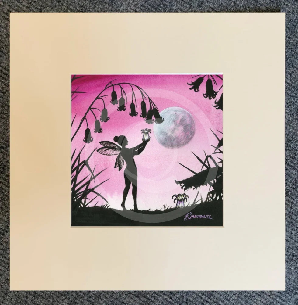 An addition to Mark Braithwaite's From the Shadows series - a flower fairy collects nectar from the bells of a flower by moonlight beneath a pink sky.