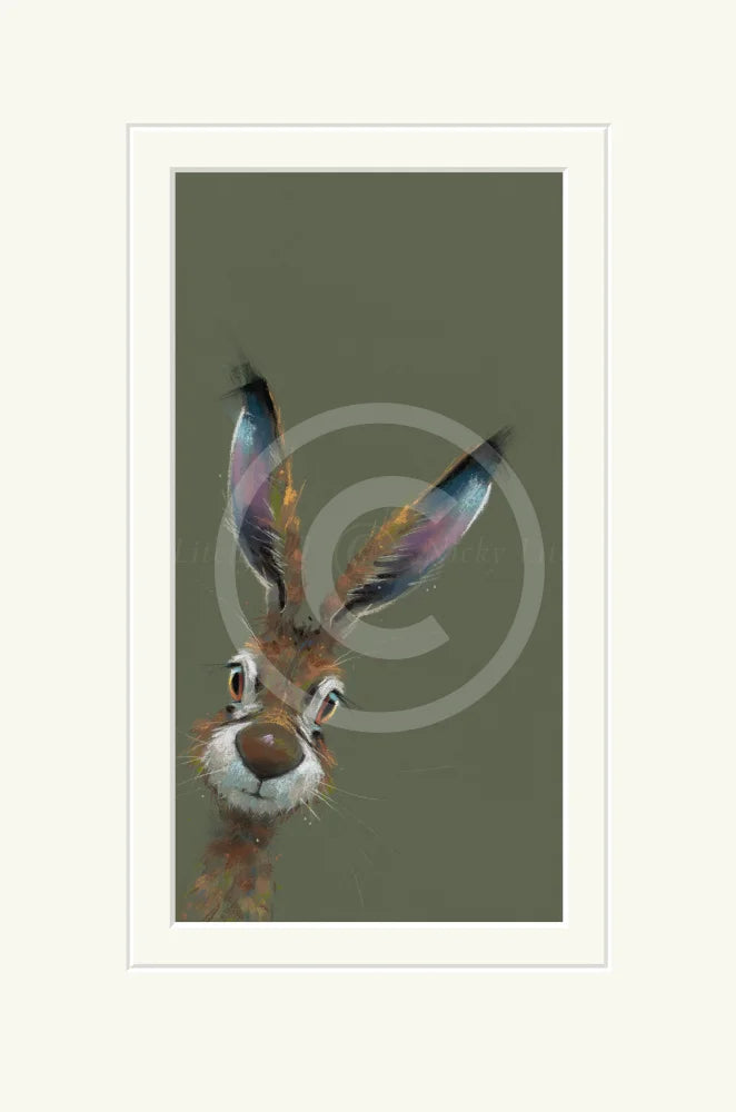 An Autumn 2025 release from Nicky Litchfield, this delightful hare peers curiously around the corner to say hello. The background is a lovely woodland green - a new colour for Nicky's palette.