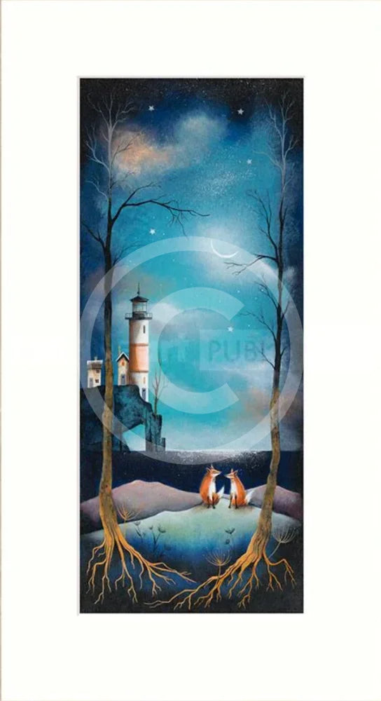 Gary Walton's 'I Found You' captures a tender encounter between a fox and its cub against the backdrop of a charming lighthouse coastal scene. With his signature whimsical style and warm, inviting palette, this enchanting limited edition celebrates the bond between parent and young in Britain's coastal landscape.