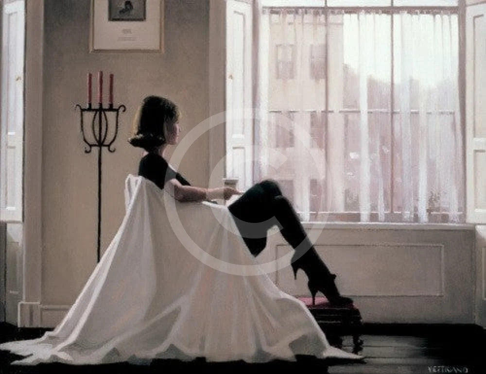 Jack's style is instantly recognisable - he sets the scene and leaves it to the viewer's imagination to decide the narrative. We see a beautiful woman gazing through the window of an upstairs apartment. The chair she sits on is covered by a sheet. Why this is and what she is thinking is left to us….