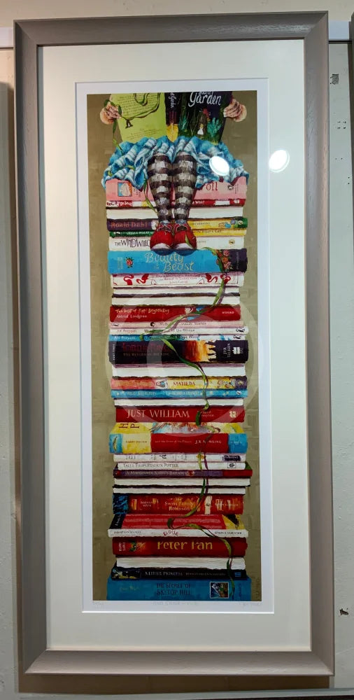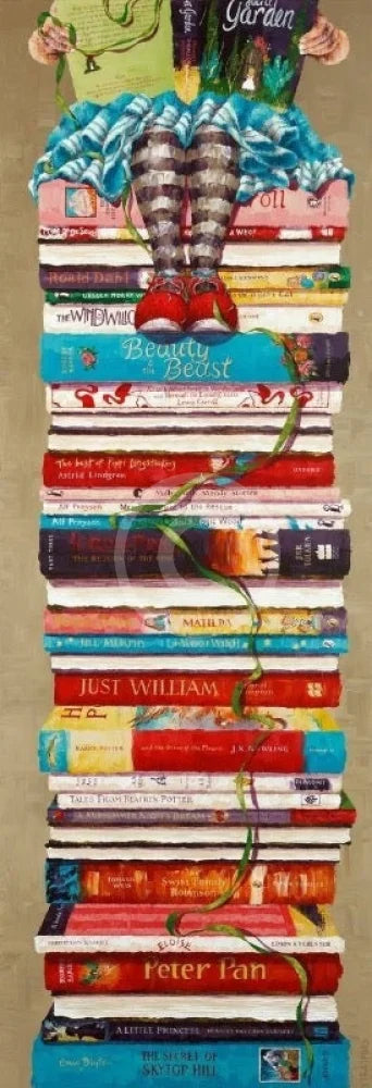 A delightfully nostalgic literary themed children’s book cover art print from Amanda's Girls on Books series. Amanda has created this wonderful image by incorporating the spines of a large selection of well-known and classic titles which have been enjoyed for decades by children and young adults. Authors and series include Enid Blyton, Peter Pan, The Swiss Family Robinson, Beatrix Potter, Just William, The Worst Witch, Matilda, Lord of the Rings, Mrs Pepperpot, Milly Molly Mandy, Pippi Longstocking, Alice’s Adventures in Wonderland, Beauty and the Beast, The Wind in the Willows, Roald Dahl and Dr Seuss.