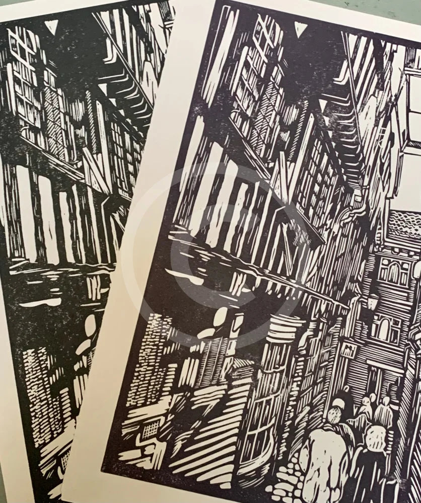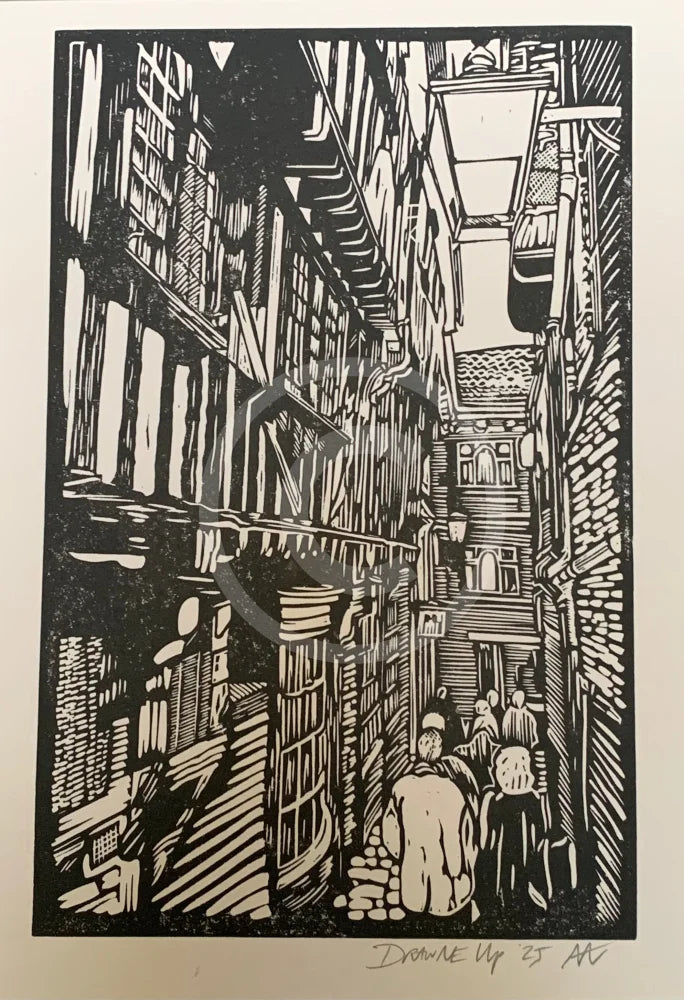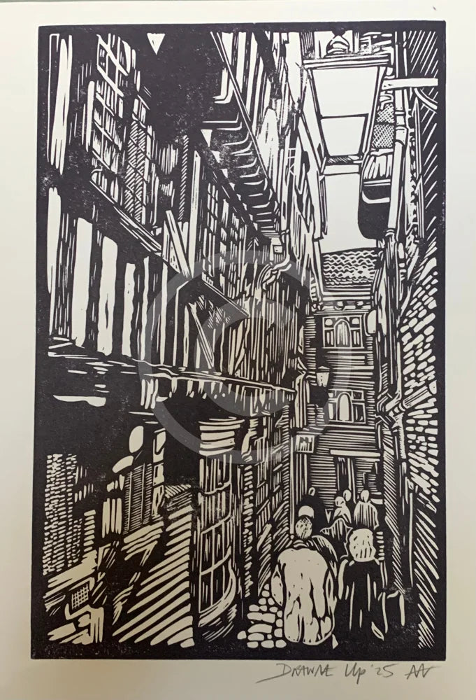 A linocut of the half timbered buildings of Lady Peckett's Yard, off Pavement, by York based artist and print maker Drawneup.