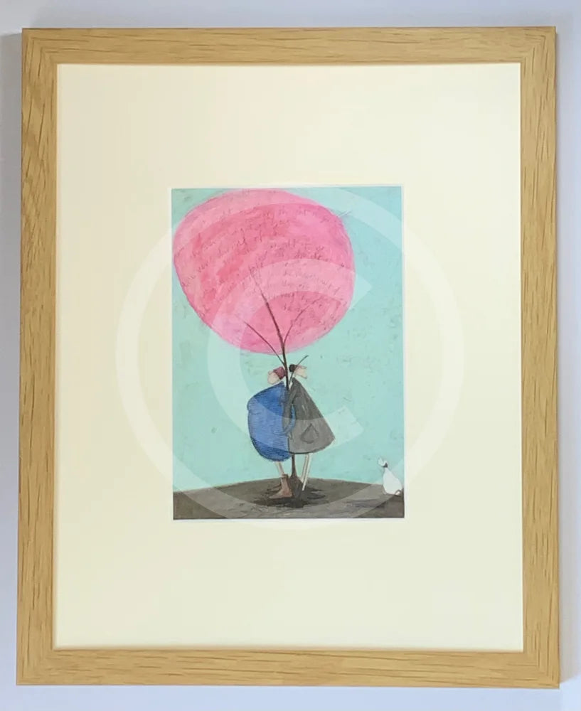 Ernest & Violet stand back to back in a loved up world of their own. The large pink tree above is filled with the words ‘The Very Thought of You’. The romantic perfect gift for Valentine’s Day or an anniversary. Each print from Sam's ‘Meet the Mustards’ Collection is presented in an antique white coloured mount measuring 240x300mm, with an aperture size of approximately 120x170mm.