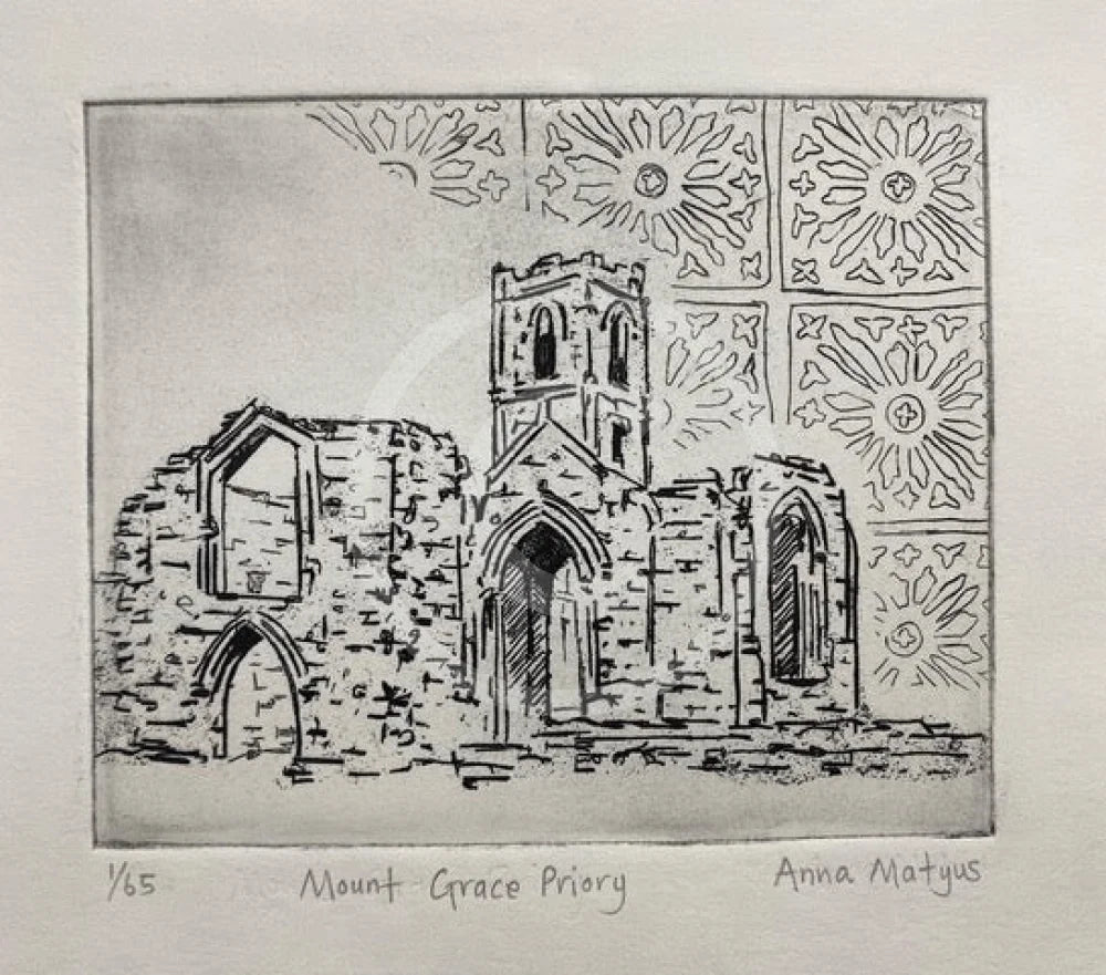 A limited edition etching of North Yorkshire's Mount Grace Priory by artist and printmaker, Anna Matyus.