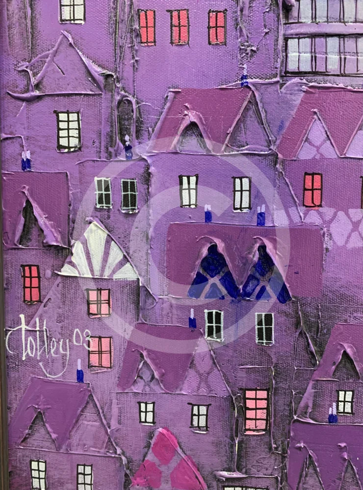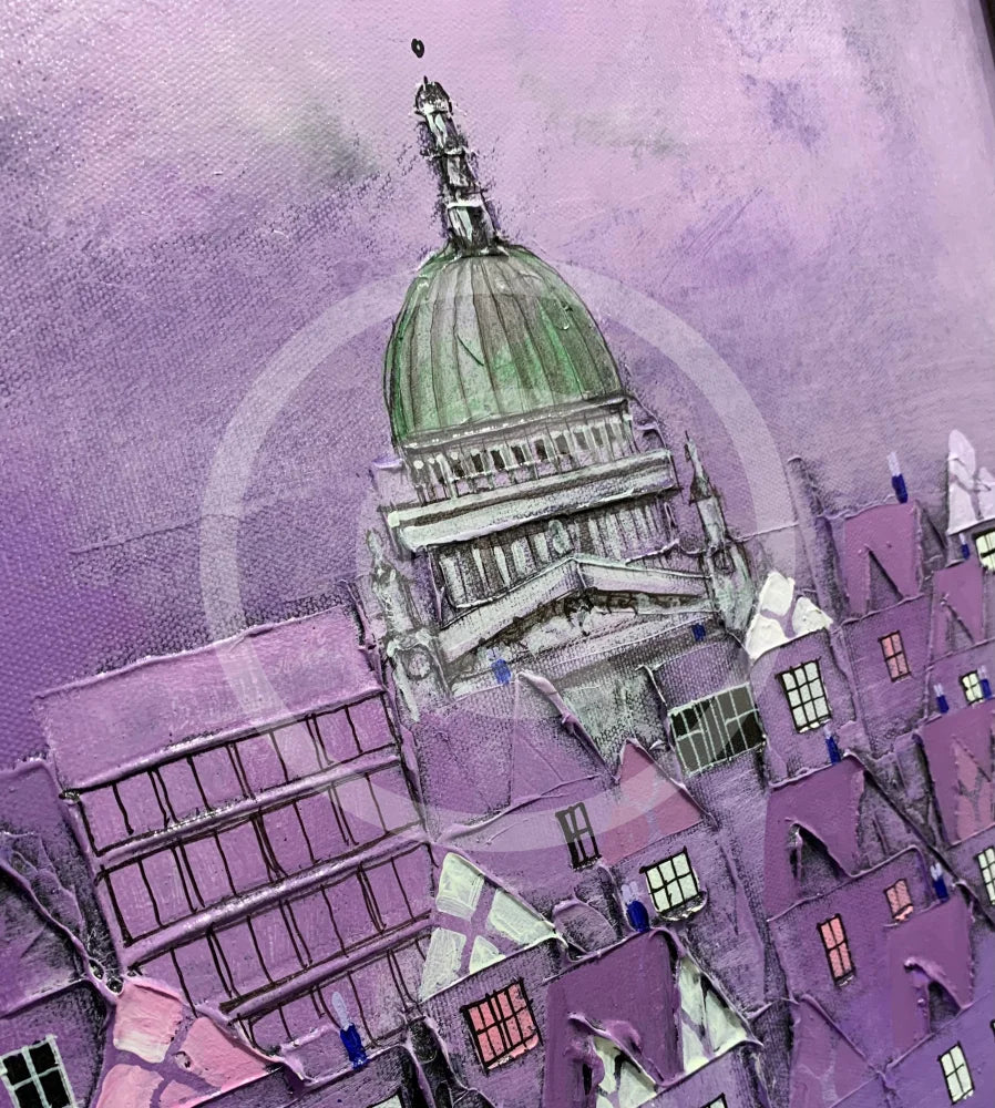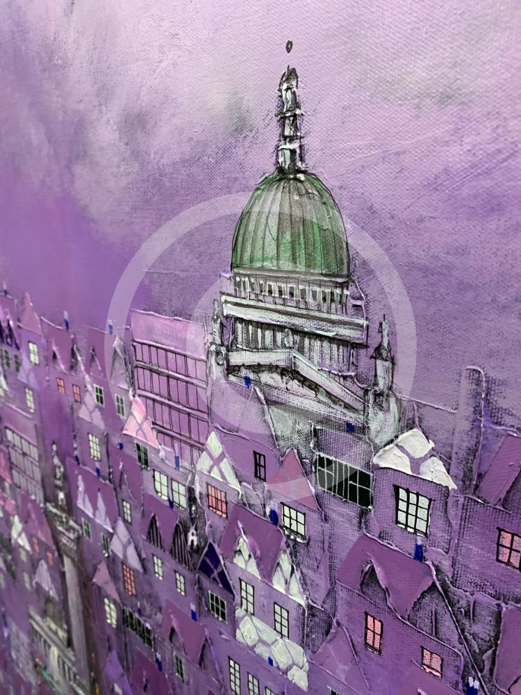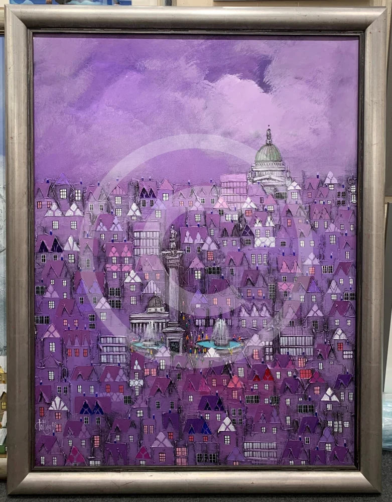 The original is painted in acrylic on canvas, in Bill's instantly recognisable textured style. The painting shows a bustling cityscape of the city of London, full of quirky little houses, topped with the dome of St Paul's cathedral. Brightly coloured people crowd around the fountains in Trafalgar Square beneath the landmark of Nelson's Column. The painting is a stunning use of shades of purple, mauve and lilac.