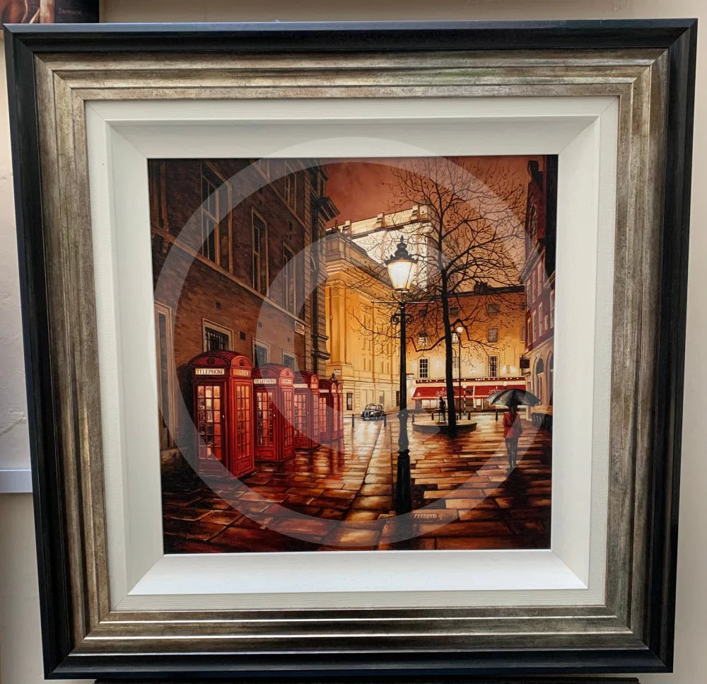 Chorus Line features the famous line of telephone boxes behind The Royal Opera House in London's Covent Garden. Just visible in the backgound is Enzo Plazzotta's sculpture "The Young Dancer."