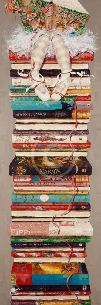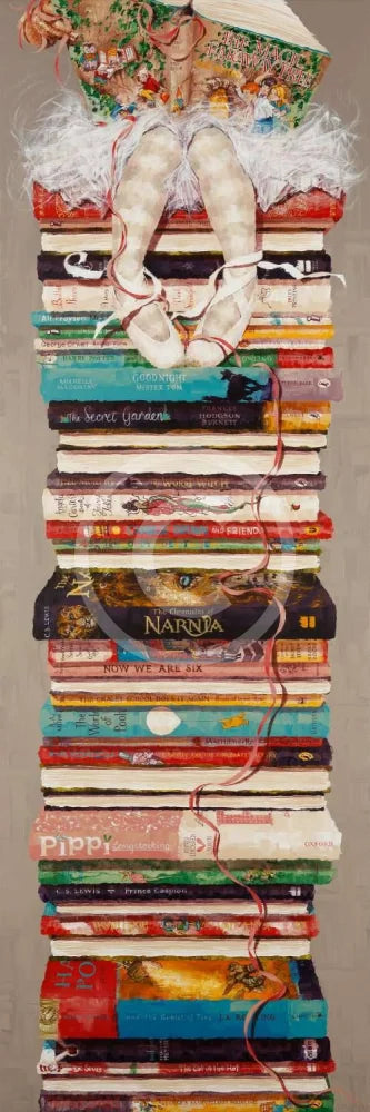 Set against a gentle taupe coloured background we see our avid reader engrossed in her favourite copy of The Magic Faraway Tree and wearing a white net tutu, striped white and beige tights and white ballet slippers.