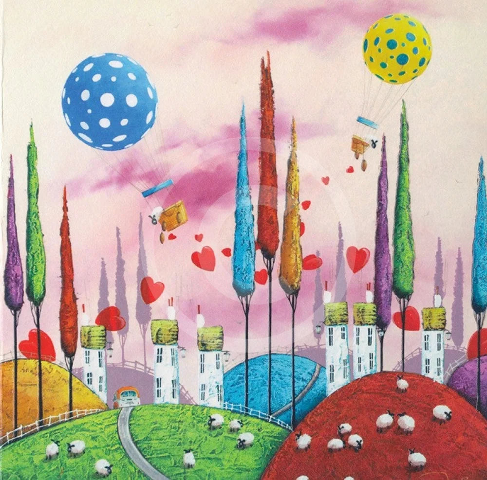 Ram-arkable Weather has all of our favourite Dale's Bowen elements - hot air balloons, fluffy sheep, and a VW camper van set against a beautiful pink background. Perfect!
