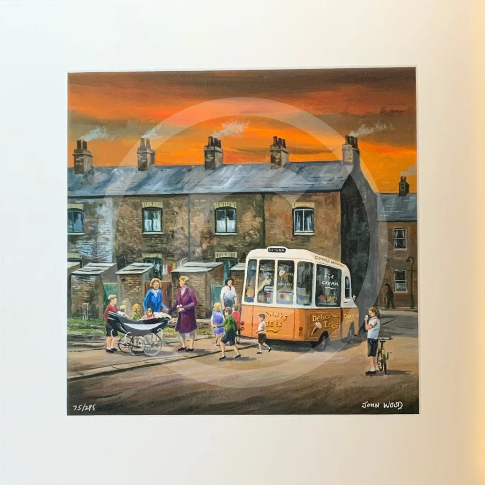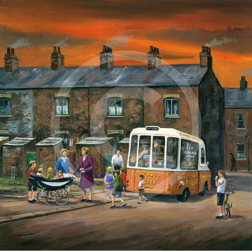The sun is out, the week is done, and Anny's Ices has a queue stretching down the street. Mums and children wait their turn, eyes on the prize — an ice cream or a lolly that tastes all the better for the wait. John Wood captures a golden Saturday moment from 1970s Northern England, the kind that lives long in the memory.