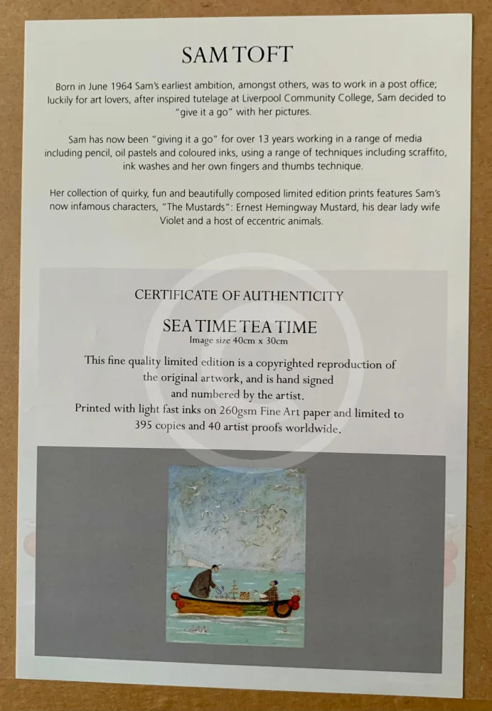 Published by Collier & Dobson, the edition size of Sea Time Tea Time is 395 fine art limited edition prints plus 40 artist's proofs. This is edition 80 of 395, hand signed and numbered by Sam. The print is mounted in an off white mount with a v-groove decorative detail. A certificate of authenticity is attached to the back of the frame.