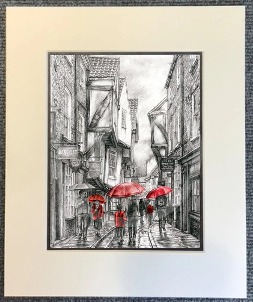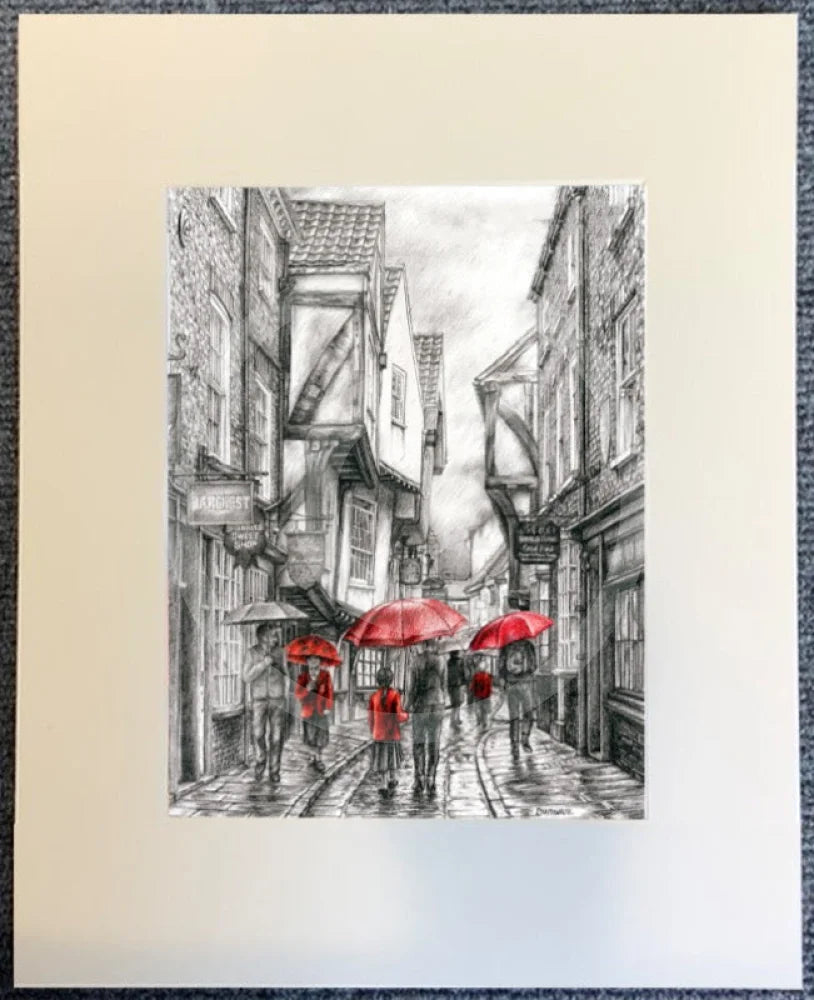 One of the most popular images in Mark’s York collection, this striking view captures the atmosphere of The Shambles on a typically English showery day. The red umbrellas and blazers of The Minster School makes the already spectacular medieval street even more stunning.