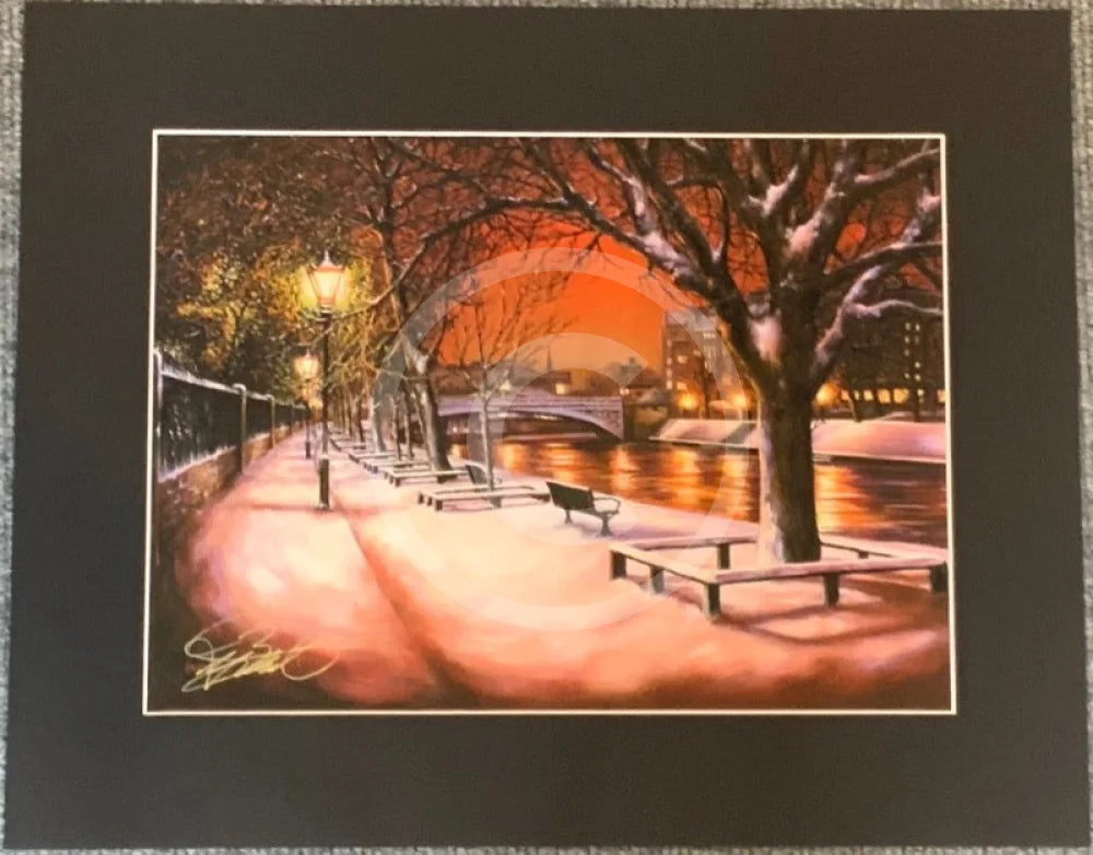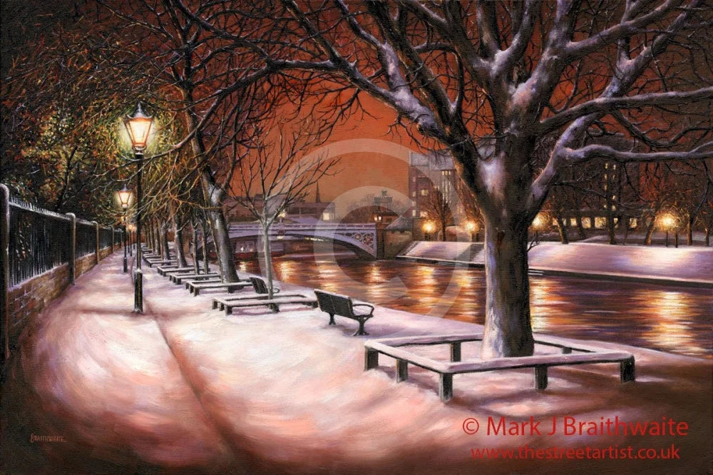 This piece of artwork shows the River Ouse at its most atmospheric.  It is a dark wintry evening and snow lies on the ground and on the branches of the trees which line the path on both banks of the river.  The row of street lamps casts light on the still water creating beautiful reflections and a feeling of warmth despite the season.