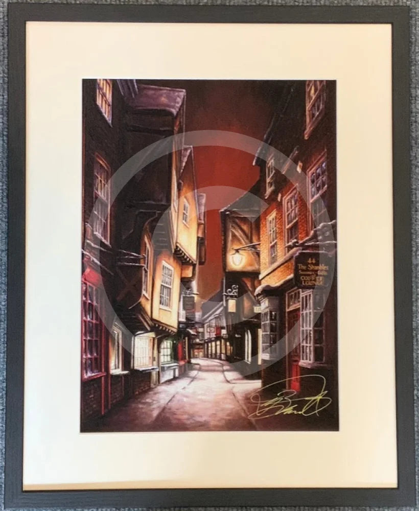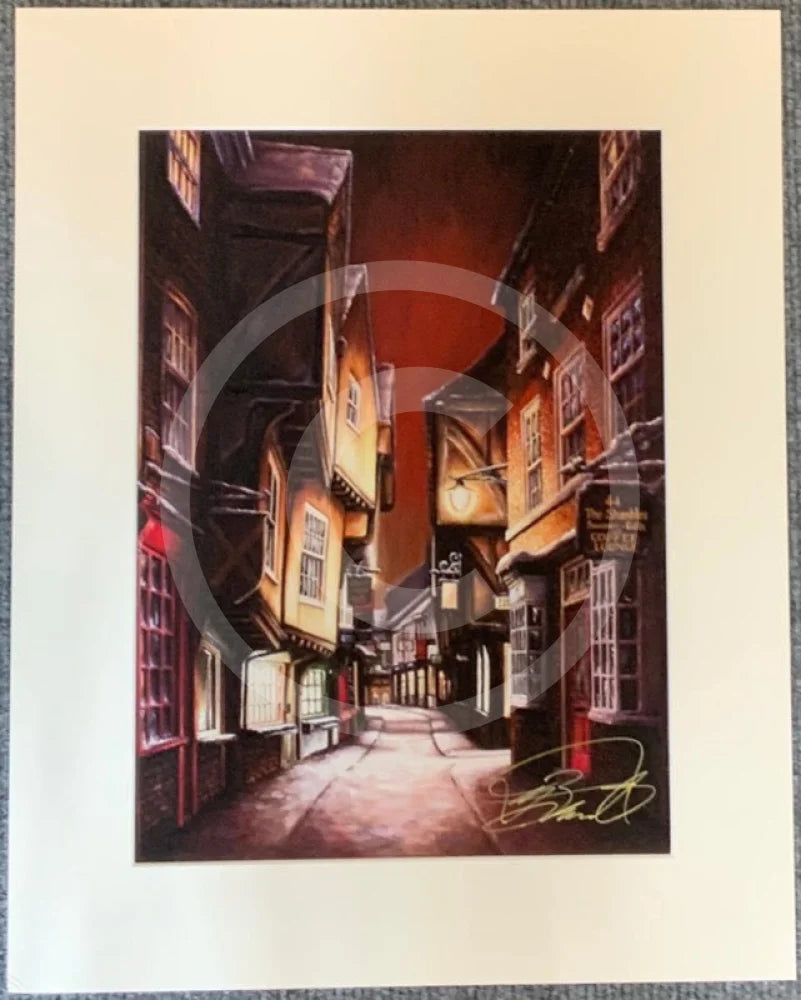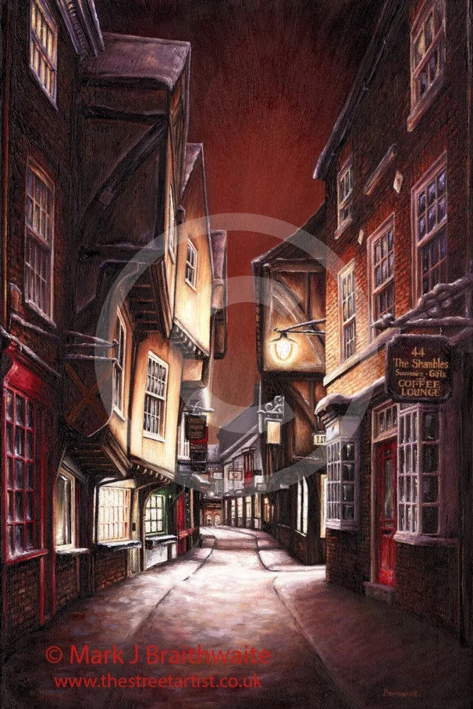 This wintry evening scene shows off York’s famous street, The Shambles, at its most atmospheric. It is one of the best preserved medieval streets in the world, originally a street of butchers, with the old meat hooks still to be seen outside a number of the shops.