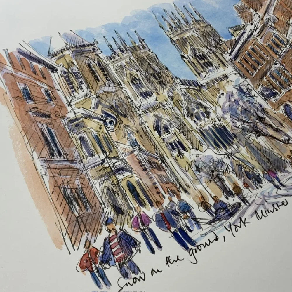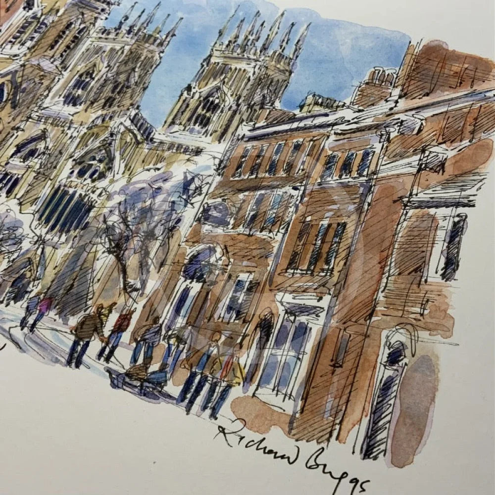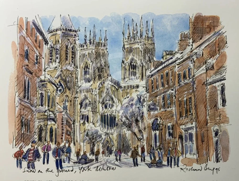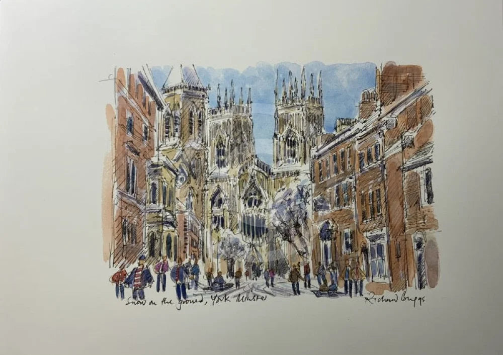 An original line and wash watercolour illustration on paper by artist Richard Briggs. This beautiful cityscape painting of York captures the city on a crisp snowy Winters day. York Minster towers in the background as people have fun in the snow, with one or two even pulling children on sledges! This original painting is signed by the artist and is presented purely as a painting on paper, but can be mounted and framed if required.