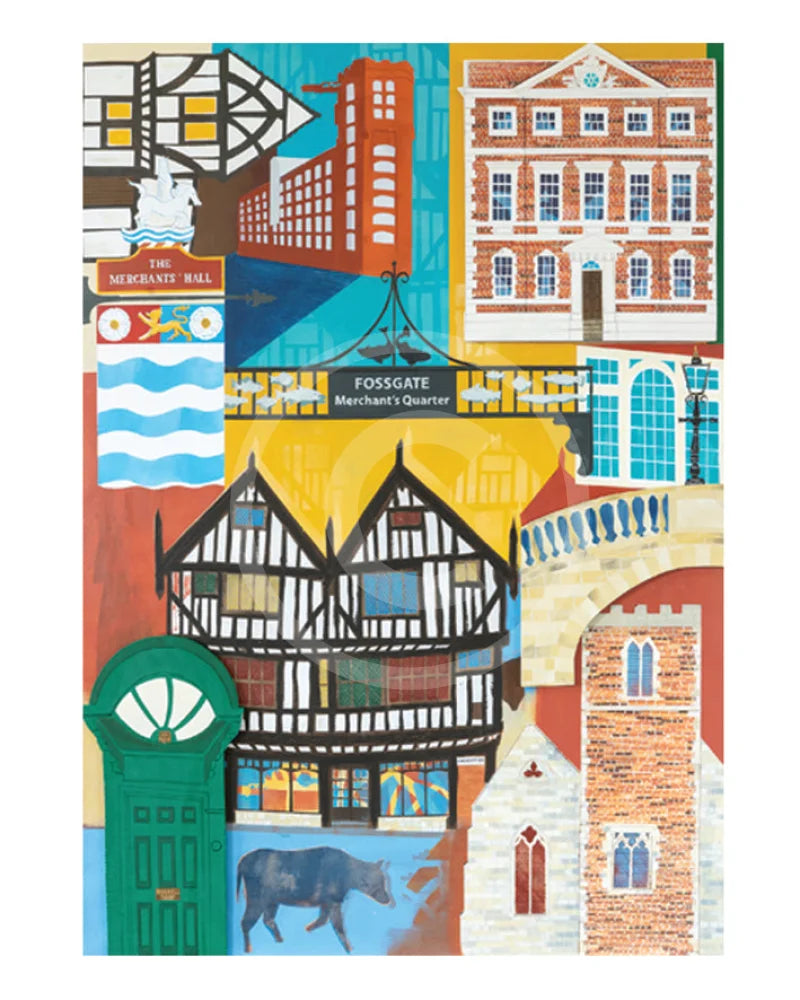 There are five prints in this series, which was commissioned by York Conservation Trust in 2024. Each print includes some of the Trust’s buildings alongside other important architecture in York. I have included some statues and symbols of significance too.