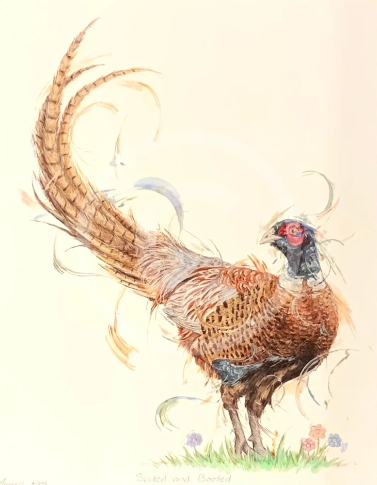 A large colourful country style image of a pheasant by Aaminah Snowden.