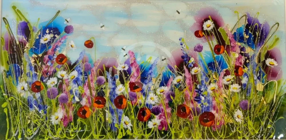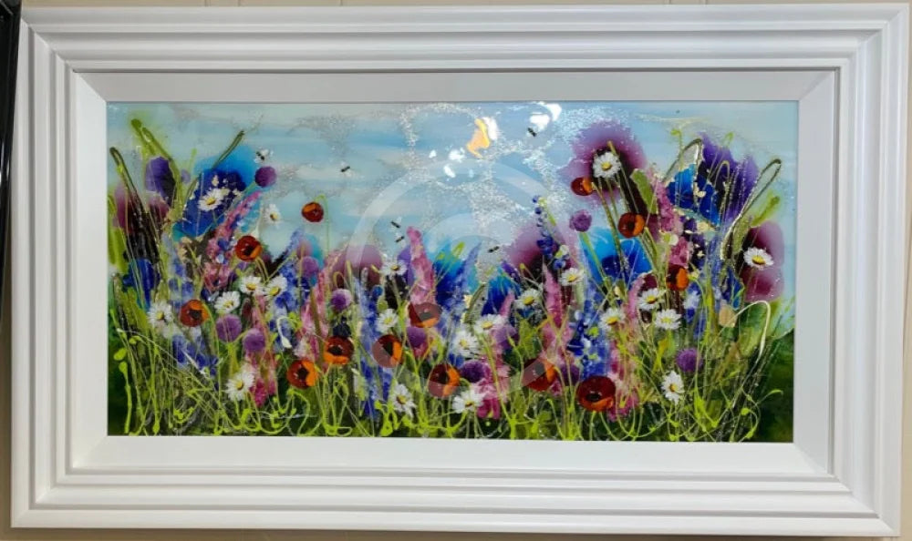 A stunning original landscape painting in mixed media by best selling artist Rozanne Bell. This stunning floral landscape features a summer meadow full of wild flowers and striking red poppies blowing in the breeze. Roz paints in textured acrylic on board with multiple layers of resin giving the picture a wonderful glossy effect which makes the rich and vibrant colours really shine in the light. The painting is presented in a shaped matt white wood frame with white inner slip.